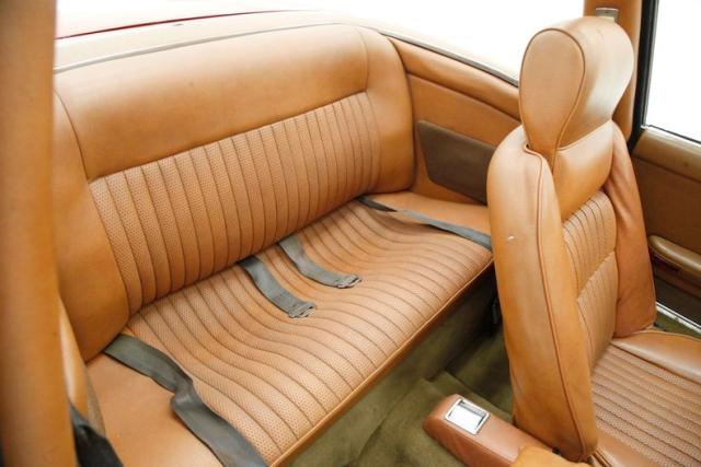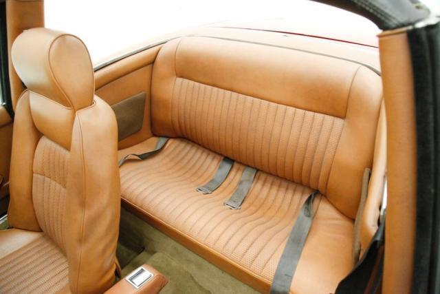 Sleekly styled deep saddle leather door panels sporting sloping downward long armrests and a shiny actuator along with a front mounted pouch greet us upon entry. Nice high and wide overstuffed luxurious bucket seats with some tuck and roll inserts and smooth bolsters all in the saddle leather, make up the front passenger\'s chairs. For the back, a curved and undulating rear bench seat is in and offers up room for two more, albeit tight on the legroom front. Gold carpeting floods the floors, (I believe this to once be more brown but has lost some of its color and now is gold). Upfront a walnut veneer wood dash front houses the quintessential black faced Smith\'s gauges. There is a gaggle of these circular gauges and air vents are round as well making it look similar to a 747 cockpit. In the center is a Pioneer AM/FM/Cassette radio, temp sliders with an ash receptacle which dives downward and seamlessly meets up with a console that has a ball topped shift lever and power window toggles. A wood insert is surrounded by padded black vinyl on the sides. In front of the passenger is a glovebox and an eyeball vent in the corner. Overall the dash is slightly dirty and could use a good detailing but fully functional. Heaven holds a place for those who pray..Hey, hey, hey.