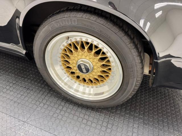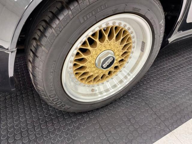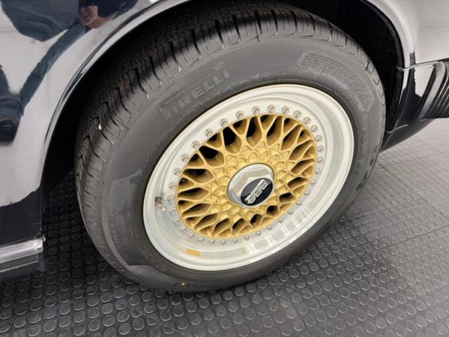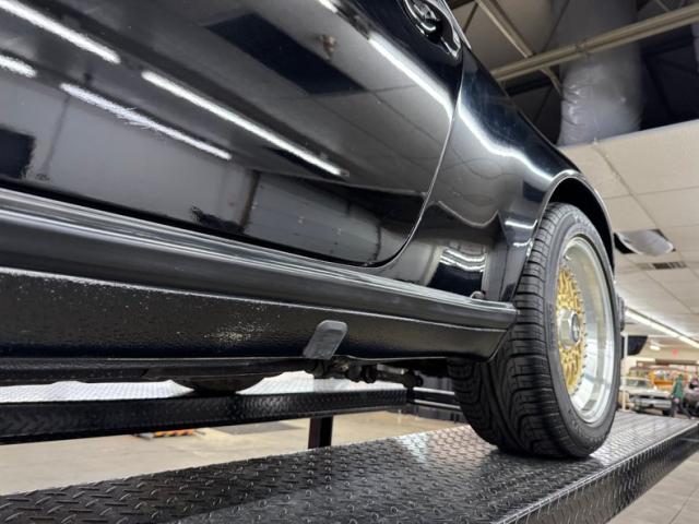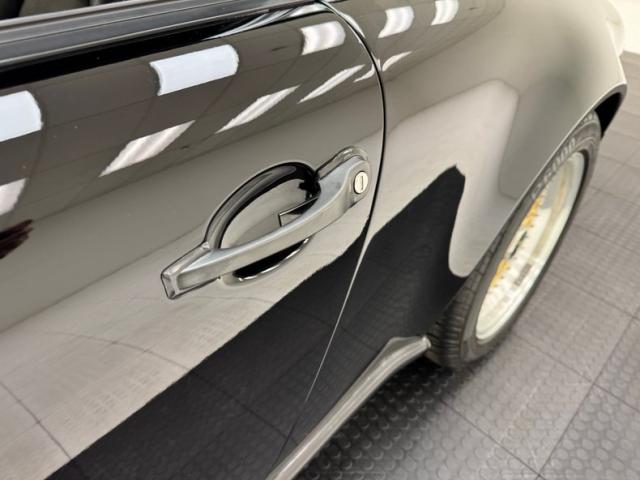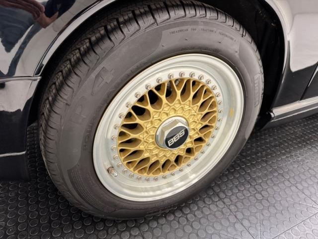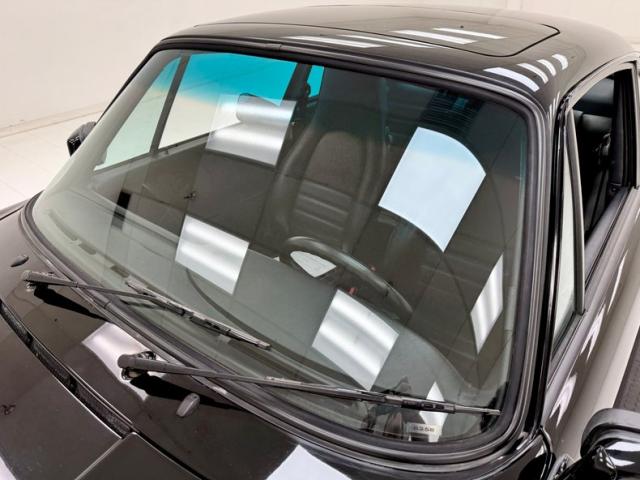 The classic lines of the 911 look good in any color, but many prefer black and we\'re not going to argue at all. Protruding headlights flank a rising hood that coasts almost seamlessly into the windshield. The roofline is flat, temporarily, then takes an epic dip to the rear creating a short, pointed tail that sheds wind after borrowing some of it to cool the engine through a grille in the stern. Capping the rear is the light bar that connects the tail lights and spells out the magical brand name, all underscored by Americanized bumpers. And because you don\'t really have to brag, the Carrera call out is black, almost ghost-like on the decklid. 16-inch BBS wheels in gold are a superb choice here and their polished rims provide ideal contrast. Imperfections are few with some blemishes in the clear on the front hood, a nasty and sizable scuff by the passenger door, and a cut in the extended bumperette.