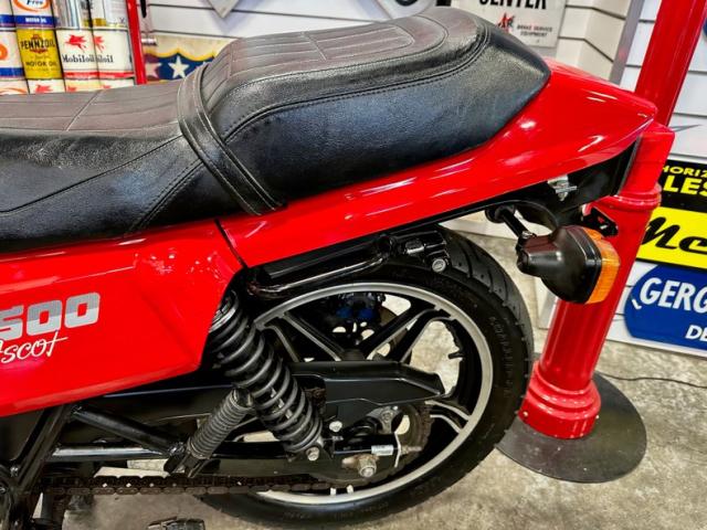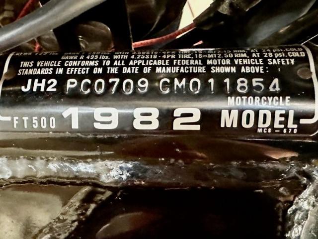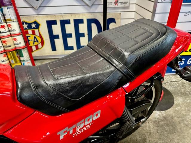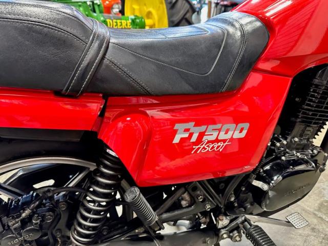 1982 Honda Ascot FT500 Stock # DGM1854 VIN # JH2PC0709CM011854. This is about as clean as they come for a 30 year old motorcycle. The odometer is showing just 13,740 miles and the bike is still in beautiful condition. These Ascots are sought after bikes, because they are such great riding bikes. The 500cc single cylinder has great power and tons of torque. The brakes are disc front and rear, which was not all that common in the early 80\'s. Starting is an ease with an electric starter. The gearbox is a manual 5 speed. The bike also has a locking gas cap and helmet lock. Everything works on this bike all lights, horn, etc, just get on and enjoy the ride. The only flaw is the clear coat on top of the tank is worn through, but it\'s hardly noticeable. These are great bikes for commuting, but are comfortable for longer trips. Hondas are very reliable and this is a bike that you can enjoy for a long time to come. Brand new Kenda Challenger front and rear tires still showing the tire nobles. Back when the ascots first came out, Honda dealers themselves were riding these Honda 500s\'s. Cond#2+.