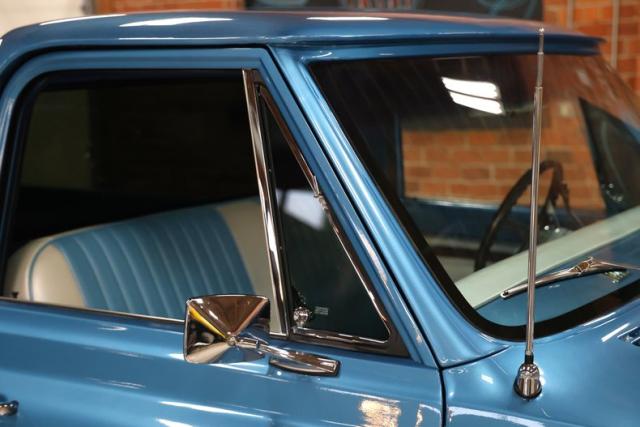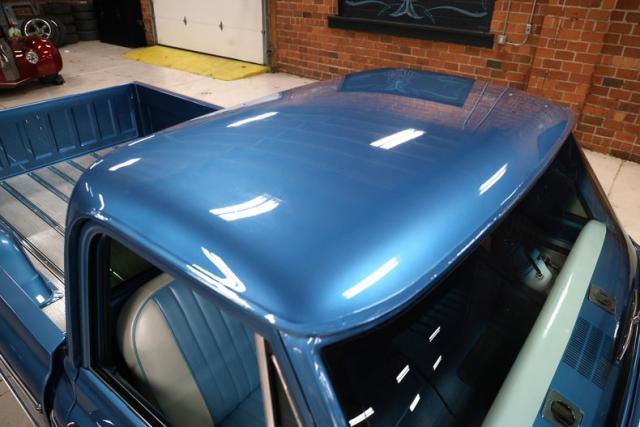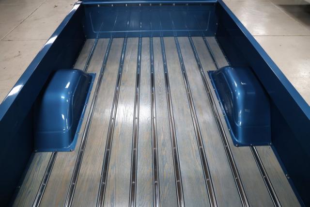 The interior keeps the same clean, classy vibe with a light blue and white theme. You get a white bench seat, gorgeous blue carpeting, and a beautifully finished blue dash with white trim. Everything ties together perfectly, giving the truck a fresh, restored look without losing its vintage soul.