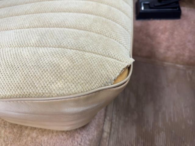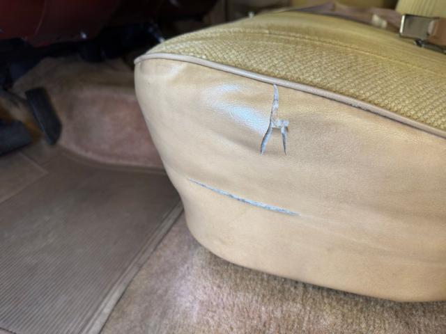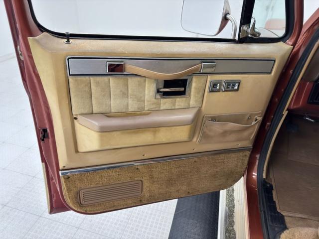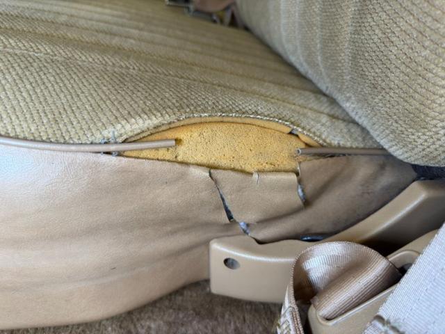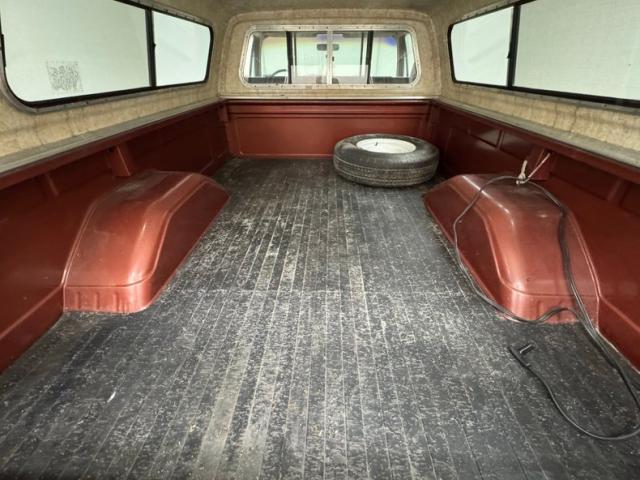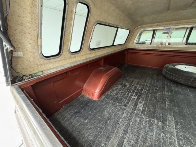 The western vibe of the exterior carries over to the interior where tan and saddle is first combined on the elaborate door panels that combine vinyl, plastic, metals, carpet, and a velour insert on a busy and functional door, each showing a bit of patina. So does the tan cloth bench which has tears on the side and seam at piping with the upper surfaces remaining relatively clean and intact. The steering wheel is intact but the center cap has a crack and the black column leads to an aluminum faced dashboard with an array of black faced gauges with easy to read orange needles. The A/C panel and AM/FM/Cassette radio are to the right while the passenger has on the clean brown dash pad and glove box ahead. Plush tan carpet covers the floor where we find the transfer case selector, all in good condition. The headliner is clean and the bed is in great shape and covered with a fitted rubber mat.