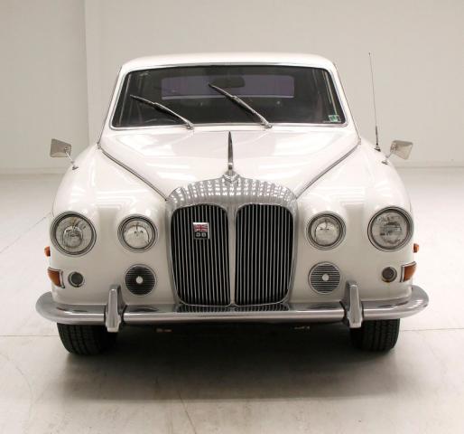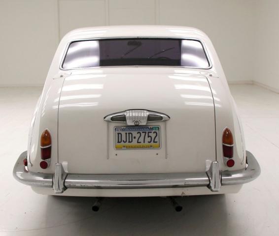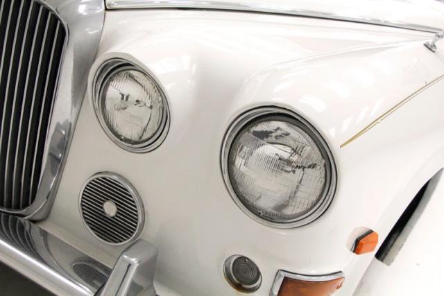With its Jaguar-esque 4 round light setup which flanks a centrally mounted grille and radiator surround, and framing by a lower thin front bumper, one can see the influences of the two companies (Daimler and Jaguar) coming together in the design of this car. It is bathed in white paint with steel panels showing some minor rust spots and scratches, but still retaining its shine. The chrome accoutrements have a nice patina and dulling and are showing signs of some early dimpling. This is true for the front and the rear of this limousine. The driver\'s door up front is the same width as the rear passengers, but due to the hinging into the front quarter panel, the side glass area is markedly less than the rear passengers. The rear glass has been tinted and has an extra window and triangular vent window which starts to follow the downward swooping curve of the trunk area. A very graceful trim spear runs through the door handles and helps frame the rear downward swoop of the body. In back, we note a large bulbous trunk another thin bumper below and dual exhaust tips hanging below. 15-inch wheels are all around with standard hubcaps.