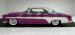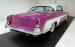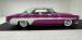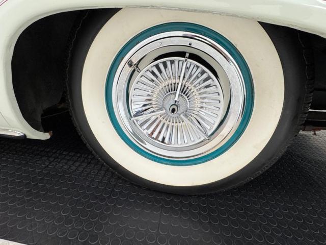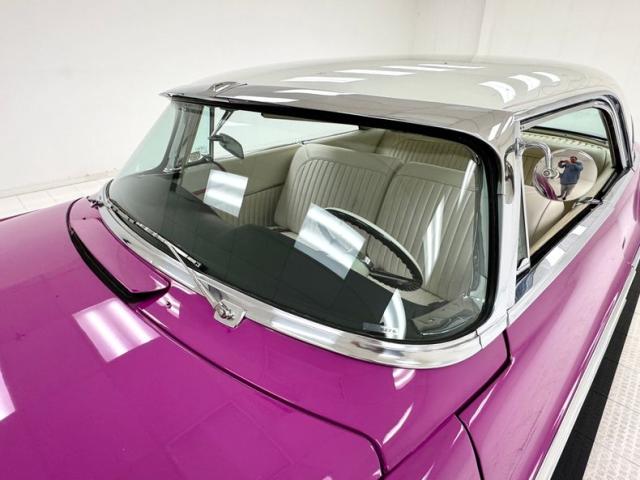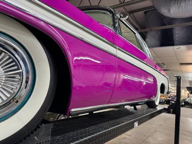 Definitely has a SoCal vibe with a low slung body wearing two stage fuchsia alternating with bright white that covers the roof and fills the distinctive panel on the sides. Polished trim borders all of the white including a robust trim piece on the C-pillar. The car\'s been expertly decked, nosed, and shaved and the Fireflite name bears out in flame outlines on the sides and along the roofline, while pinstriping encircles the car with elaborate flourishes front and rear. Ornate wheel covers cap the 15-inch wheels that emit a ring of teal colored steel. Imperfections include some light pitting on a front window frame, several scratches including a pair of sizable ones on a door, touched up chips, edge chips, spider cracks, peeling paint on a door sill, peeling chrome from a bumper, pitting in stainless side trim, ding and disconnection of another, filler evidence in door jamb, scuffs throughout, and some bubbling.