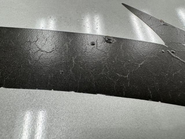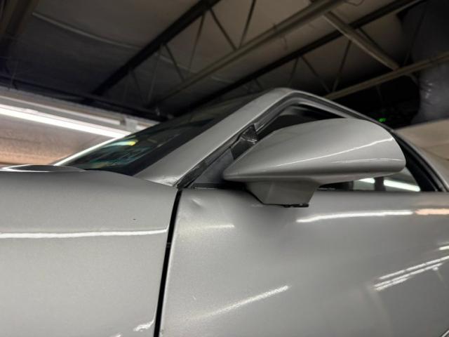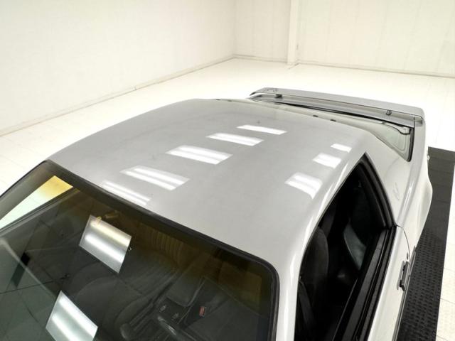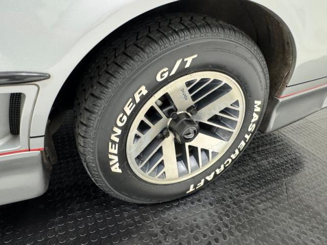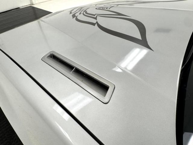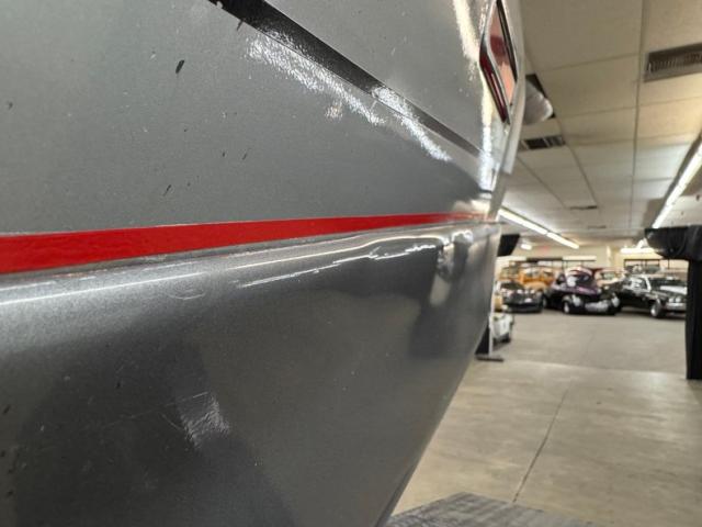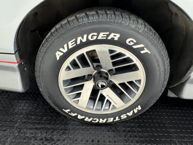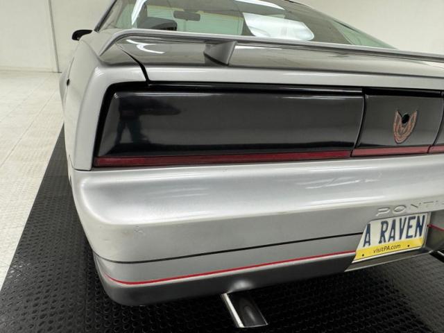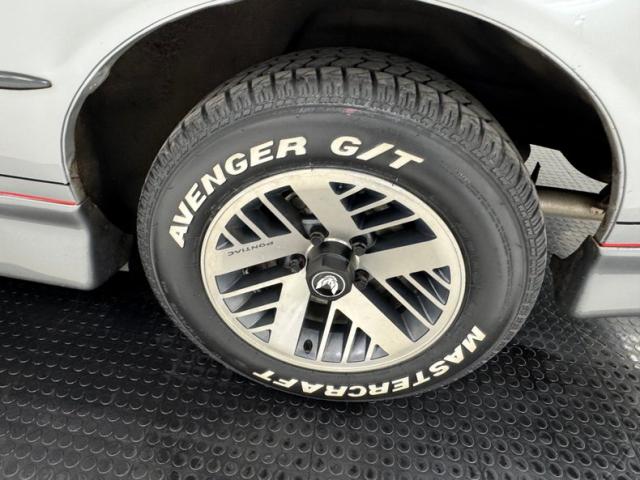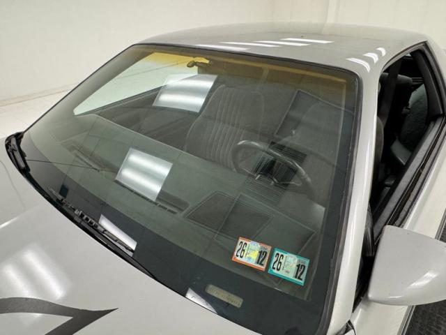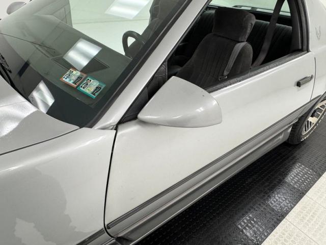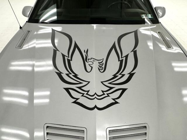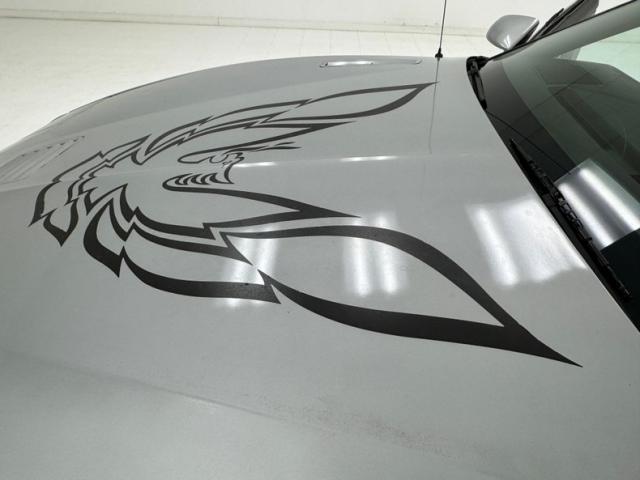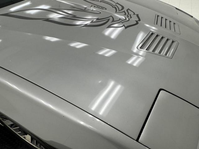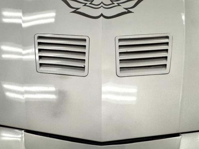The body kit offers a contrast not just in curvature, but in a darker shade of silver than the Silver Metallic of the body panels themselves, and the kit is accented by a red stripe that fully encircles the car. This slick top example features the typical hood louvers and vents that made the T/A special, while the marker lights tuck into a dark cove that underscores the hidden headlights and foglights split wide inside aerodynamic indents. Out back, an attractive smoked light bar includes the center of the latch panel while dual exhaust now shoots straight back and a wing hovers over the decklid at the end of a sloping and curved rear window. Imperfections on this one include numerous scratches and chips throughout, some cracking of the vinyl eagle, touched up chipping by the door handle, edge chipping, a ding in the door near the side mirror, some paint blistering, a corrected corner scuff on rear bumper, gap issues on front right fender, some mismatched panels or cladding, and a missing filler panel near the side mirror.