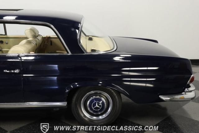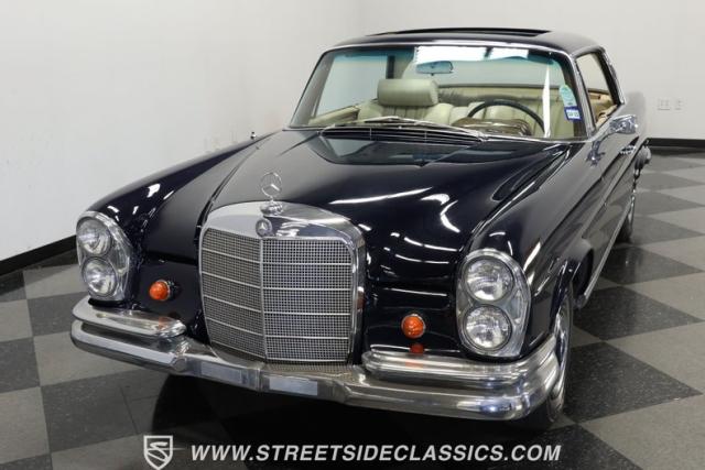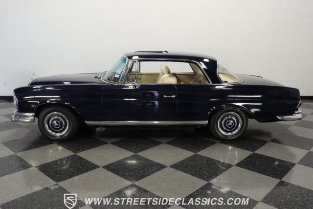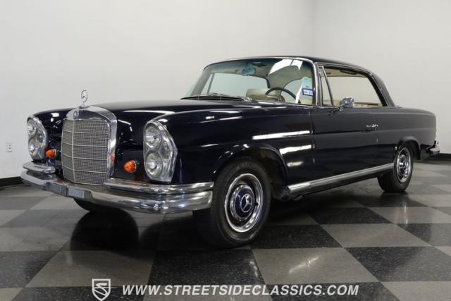 Rare European luxury comes alive in this 1966 Mercedes-Benz 250SE Coupe, finished in dark blue that accentuates its elegant, flowing lines. The sculpted profile carries distinctive Mercedes-Benz styling with perfect proportions between the long hood and passenger compartment. Chrome bumpers add a brilliant contrast against the blue paint, while the factory-style 14\" wheels maintain the sophisticated German aesthetic. Trim around headlights and windows shows excellent craftsmanship, representative of Mercedes-Benz\'s legendary build quality. The glass remains clear throughout, and the 195/75R14 tires provide proper stance to this prestigious coupe.