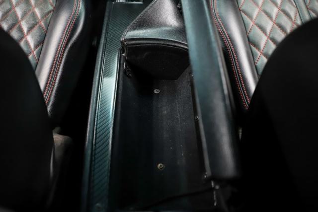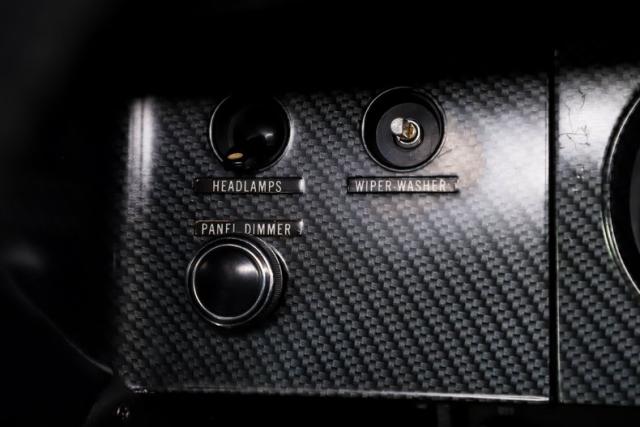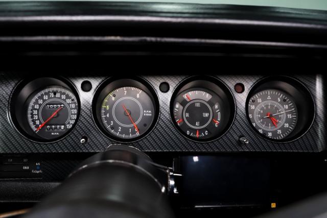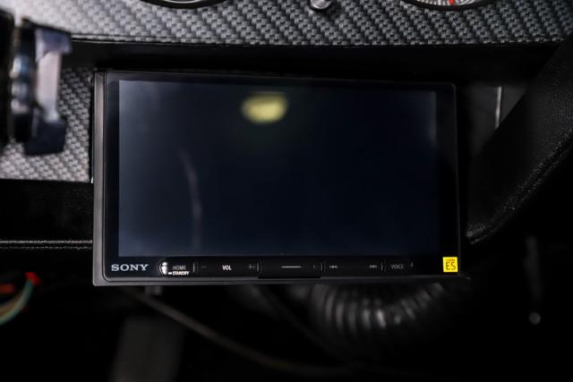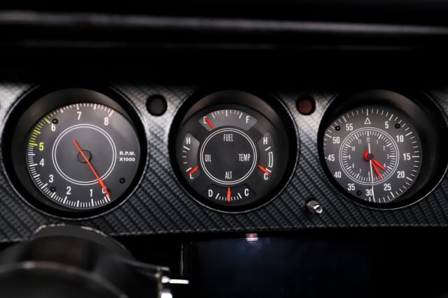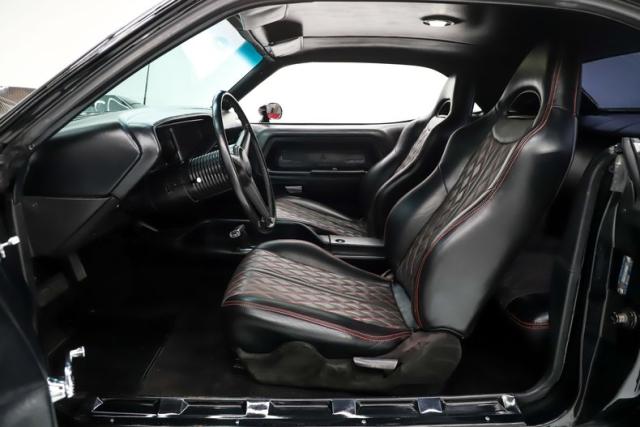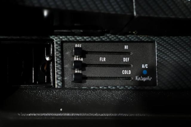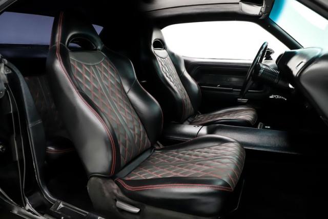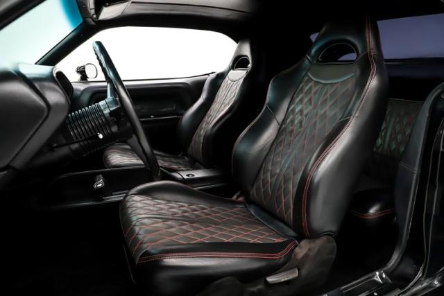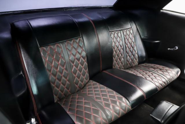 INTERIOR: Full custom! The high back bucket race seats are practical and pretty with their red diamond stitching. Just like the matching rear seat, they have fresh upholstery that is tight and fresh looking. The molded door panels are in great condition. The original style center console now has a carbon fiber finish with storage and also houses the automatic shifter. It has new Rallye gauges that look just like the originals with only 34 miles showing on the odometer. The gauge bezel also has a carbon fiber finish to compliment the center console. Front and rear cameras are connected to a large screen Sony stereo that has bluetooth capabilities. The dash pad does not have any cracks, plus the carpet and headliner have been replaced.