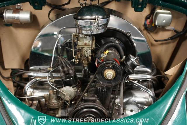 The 1200cc four-cylinder engine pairs with a 4-speed manual transmission for authentic air-cooled performance. The dual-to-single-to-dual exhaust system creates a distinctive sound. The torque-arm front suspension and torsion beam rear setup with shocks deliver predictable handling, while drum brakes at all four corners bring everything to a stop. The engine bay maintains a clean, stock appearance with tidy wiring and properly routed hoses.