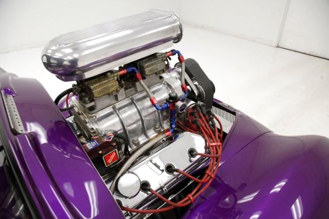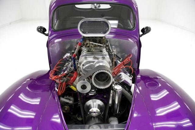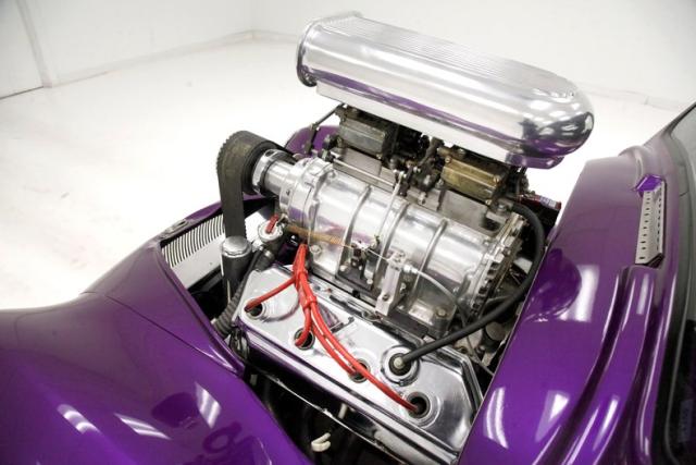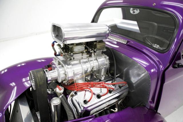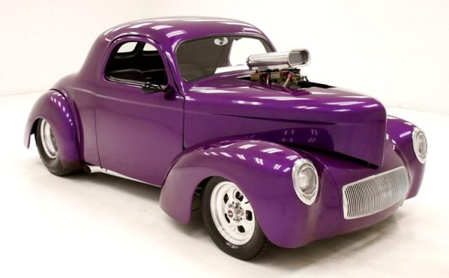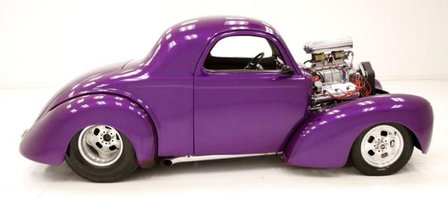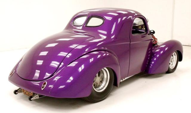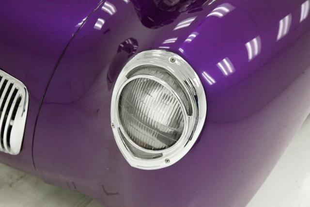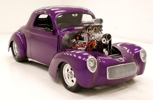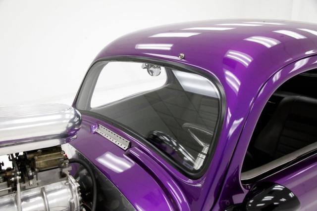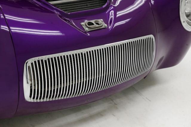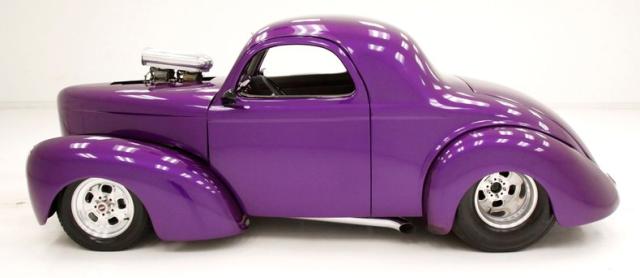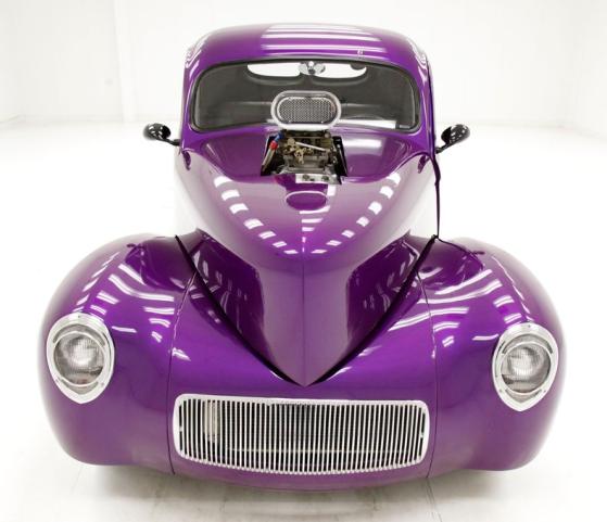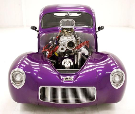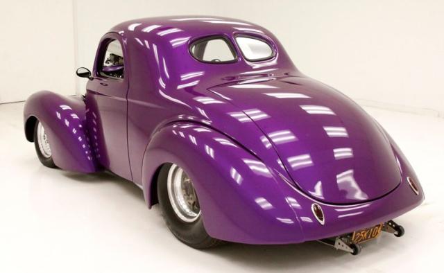 For consignment, a wild and wooly Willys, right out of the look of 1941. This street legal drag car has been 20 years in the making and was completed in 2020. A consignor stated Keith Black 1966 Hemi engine formerly used in a funny car is open for all the world to see. We possess no documentation to back this up, so we\'ll take his word for it. This is a sculpted fiberglass body on a tubular frame, is painted in wild grape purple, and it has a beautiful gray/purple accented interior with some conveniences.