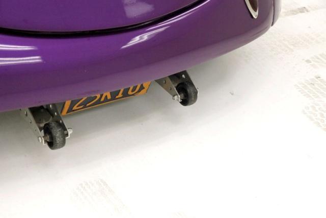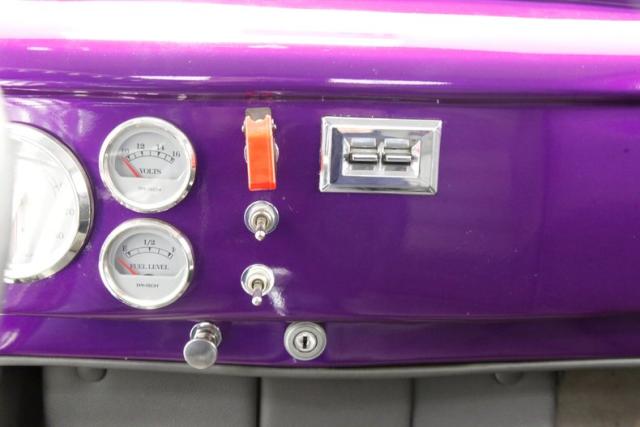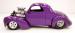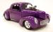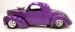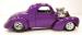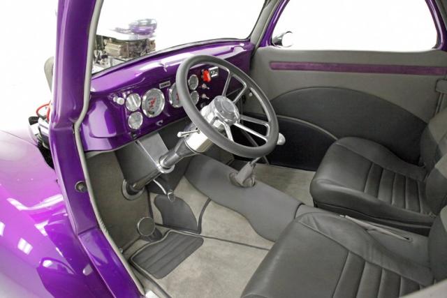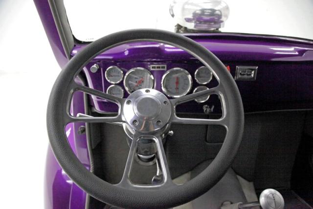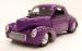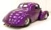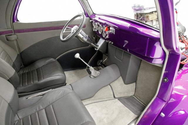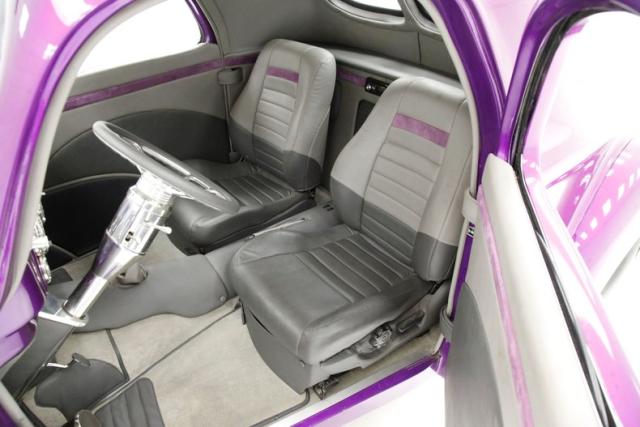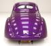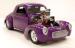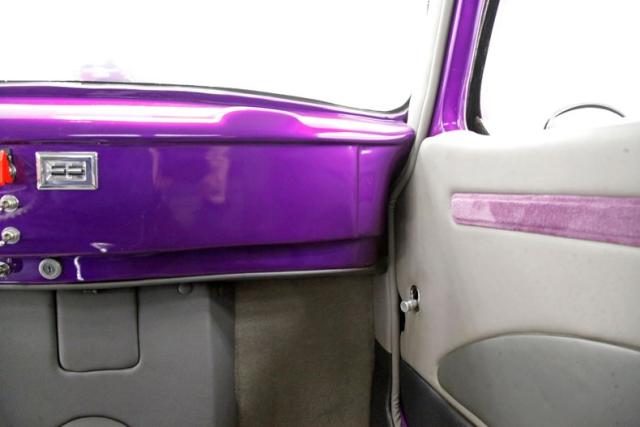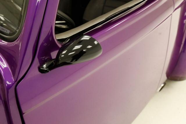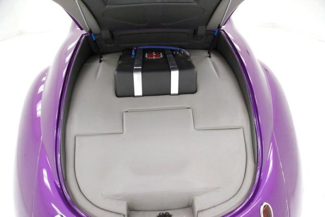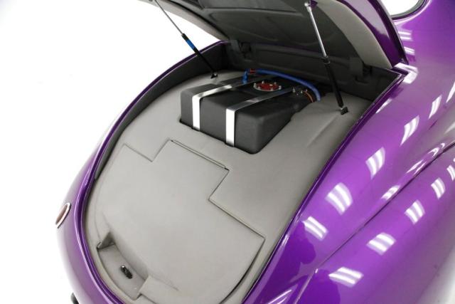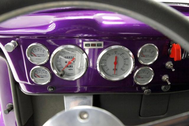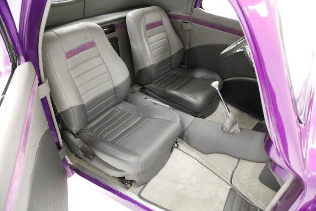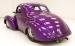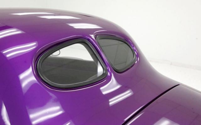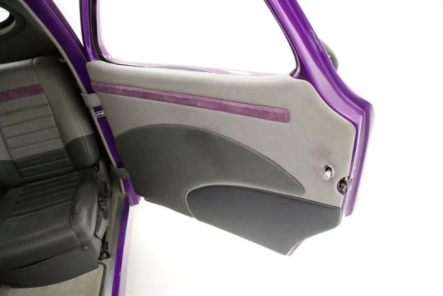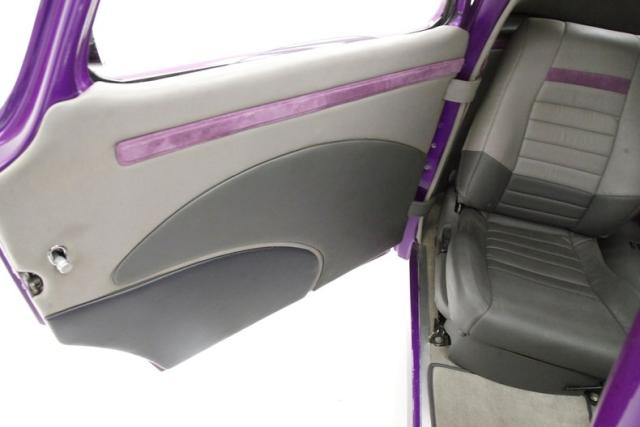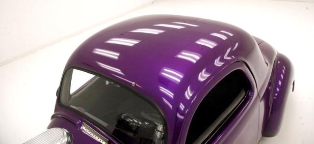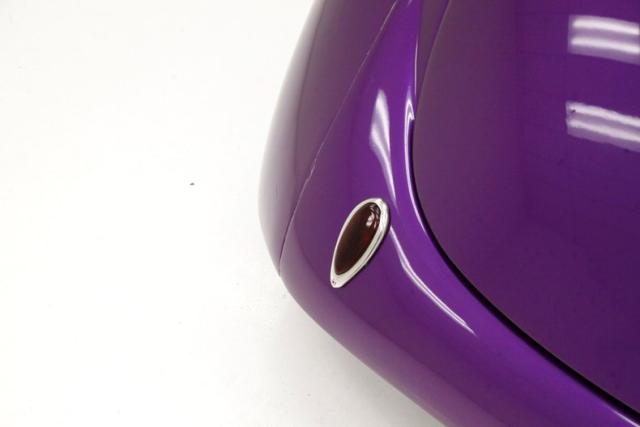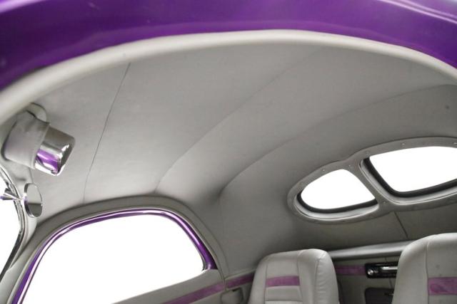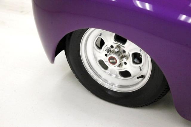 With front and rear bumpers as well as door handles shaved, teardrop headlights, custom rear taillights and some massive side exit pipes she\'s a runner and looks as though she\'s moving when standing completely still. The purple uppers and fenders of the car become curvaceous pieces of art framing large rubber below them. A nicely rounded roofline melts into the trunk line which is flanked by the rear fenders and rear roll pan which together they appear to have the shape of CInderella\'s slipper. Up front, a curved vertical ribbed grille is topped by a pointy V shaped but still bulbous hood and the car looks great with or without it. Polished 15-inch Weld Rodlite wheels are wrapped in deeply treaded rubber for both the skinny fronts and steamroller wide rears. Lovely, yet frighteningly fast in looks and performance. Purple rain?!