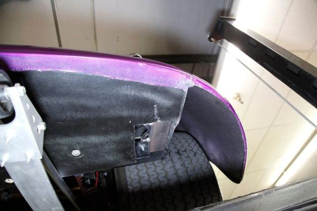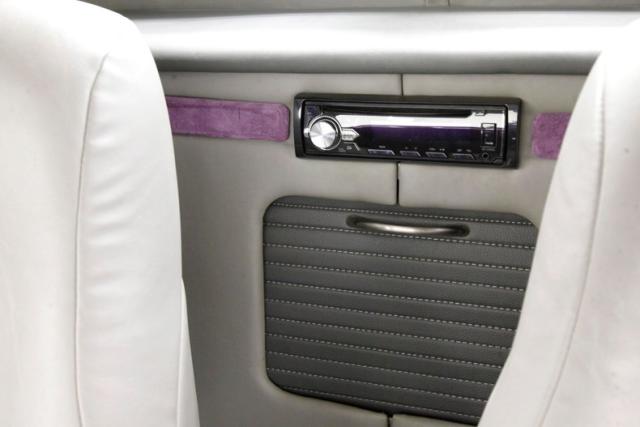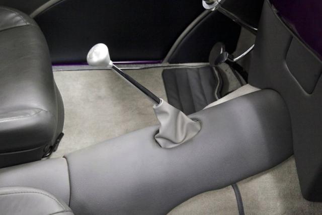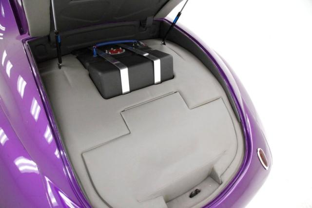 Slipping inside past the suicide hinged doors we are greeted with a purple framed doors with very nicely sculpted two tone gray leather curved panels. A billet locking assembly is seen within this padded leather field. A purple suede strip is on for some highlighting as well. Grabbing a spot in the bucket, in front of the billet styled uber padded steering wheel, I plant myself in low back tuck and roll insert and smooth bolster leather seats. These present in half of the seat being light gray and the bottom half in darker gray all leather. That purple suede strip is showing up on the upper panels of the backs. The dash which is painted in purple, has a gaggle of round shiny bezeled white faced instruments. These are TPI Tech gauges and reside here along with some warning lights, and a few billet style pulls. Power window toggles are here as well. Below is wonderfully clean carpeting with a custom fabricated hump cover in gray leather which is the background for the Lokar shifter. Beautifully tight side panels and a near perfect light gray padded headliner complete the comfortable look. Also noted behind the seats is a custom fabricated shelf which houses an AM/FM/CD digital radio and a storage bin behind a black padded white stitched door. The trunk has been finished in gray leather as well and has side storage which is hidden and a fuse panel on top neatly mounted into the leather. Fab job!