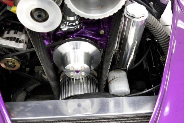 Near perfection underneath with many polished parts, black painted frame and floor pans, polished headers, and a purple bottom end to the mill. Braided stainless lines snake their way around this environment as well, and I see a rack and pinion steering along with independent coil overs in front and in back, ladder bars with coil overs. Wilwood disc brakes are all around and the polished side exit pipes have no mufflers and peek out the sides of the car.
