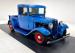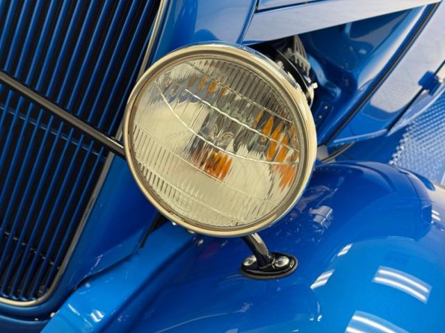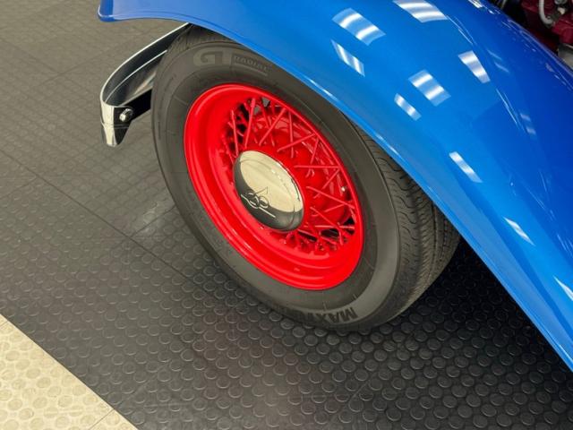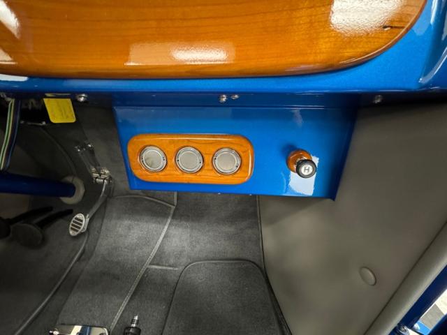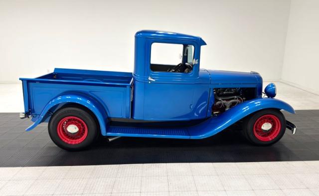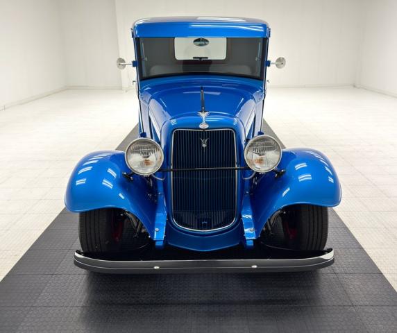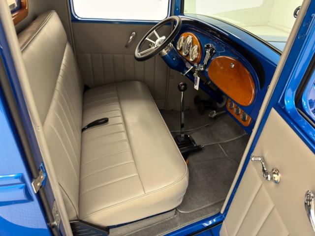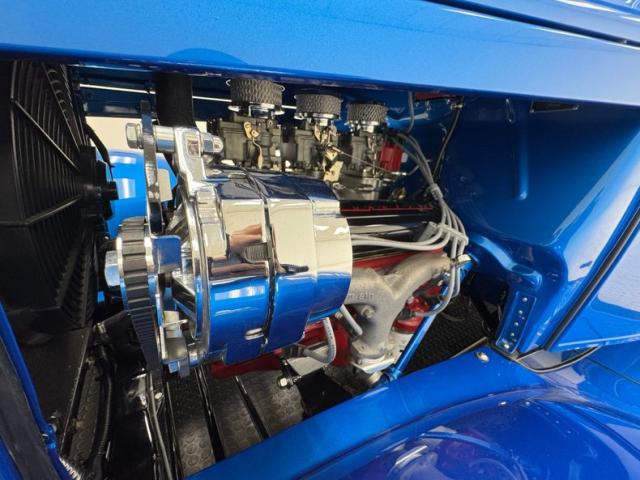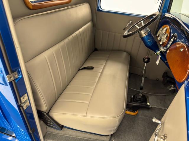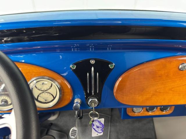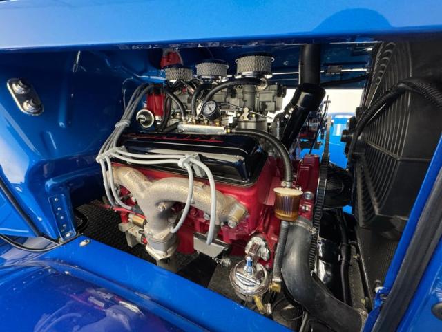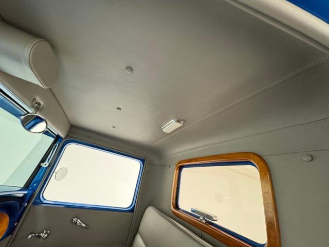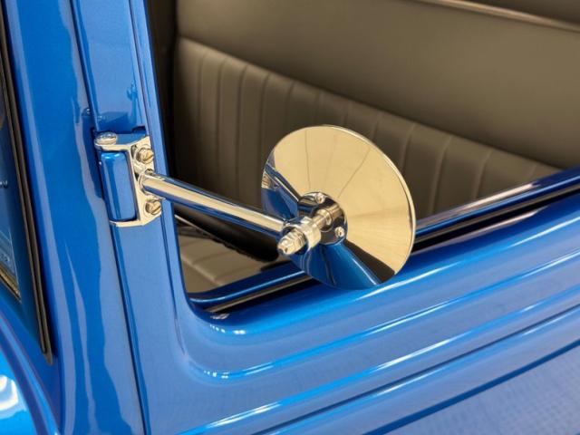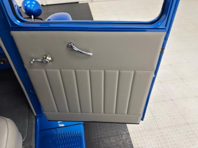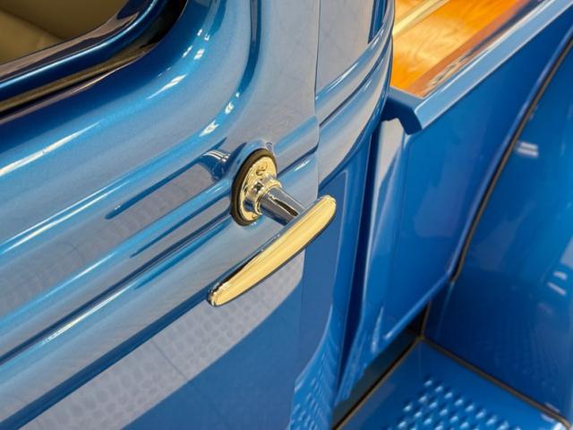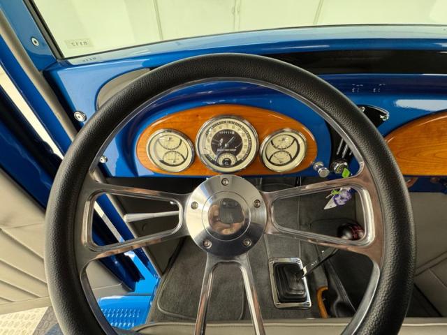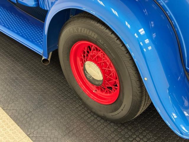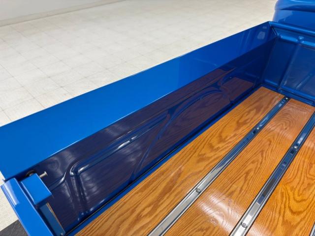 Two stage Hydro Blue shines bright on this truck and one can not help but notice the rich contrast of the 15-inch red wire wheels and their staggered tires that create a proper street rod raked stance. Headlights are mounted on a light bar that runs horizontal and parallel with the chrome bumper while the blue painted grille accentuated its polished rim and nose jewelry. The fixed rear window is home to a modern third brake light and overlooks a beautiful oak bed with stainless bed strips and clean, blue side walls. The running boards connect the sweeping front fender to the arched rear, and our consignor notes to avoid stepping on it when getting in and out. That means no rides for the kids, either. The paint, hardware, and trim are in great shape and we could not find any exterior imperfections.
