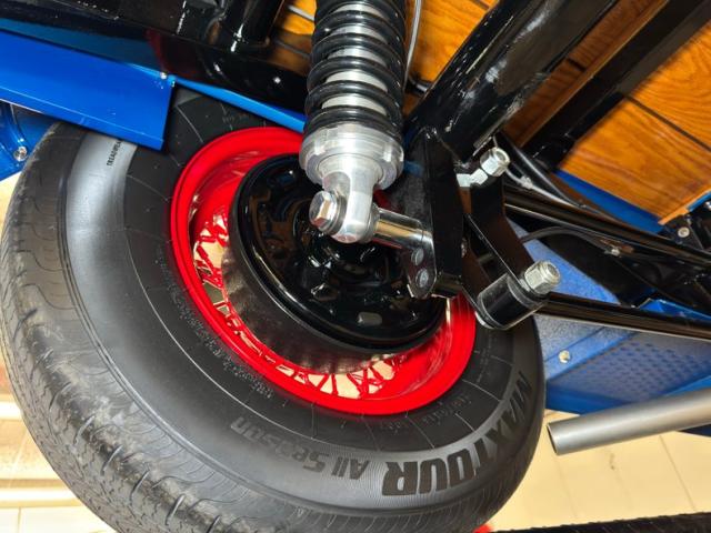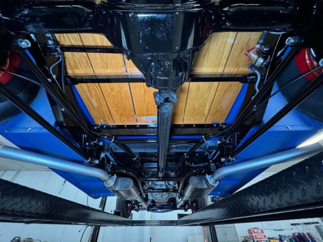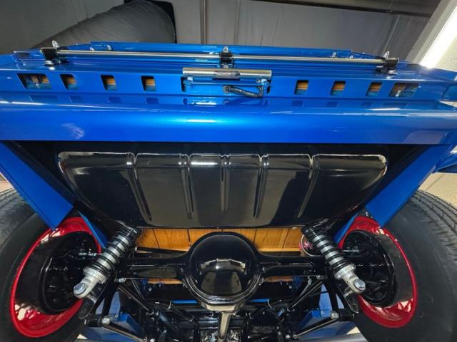 Get out your fork and knife because you can absolutely eat off of the underside of this truck! It\'s clean and glossy, free of rust and oil, and just a show piece on its own. The dual exhaust runs through MagnaFlow mufflers, then exits in front of each back wheel. Disc brakes in front, drums in back and suspension consists of a 4 bar with transverse leaf springs in front and ladder bars with coil overs in the back. Even the red wire wheels shine through underneath, introducing another color amongst the black, blue, wood, and stainless.
