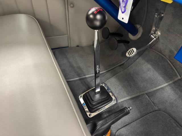 Handsome gray vinyl door panels show a stitch pattern along with smooth upper and both are exceptionally clean and matched in color and quality by the bench seat, headliner and rear wall treatment. Up front, the hot rod steering wheel leads to a body colored dash embellished with real wood faceplates, first around the very cool Classic Instruments vintage style gauges, then over the glove box and lower heater vents. More contrasting wood is found as the frame of the rear window. A straight Hurst shifter rises from the floor covered in matching gray carpeted mats. It\'s all very fresh inside.