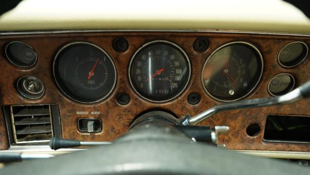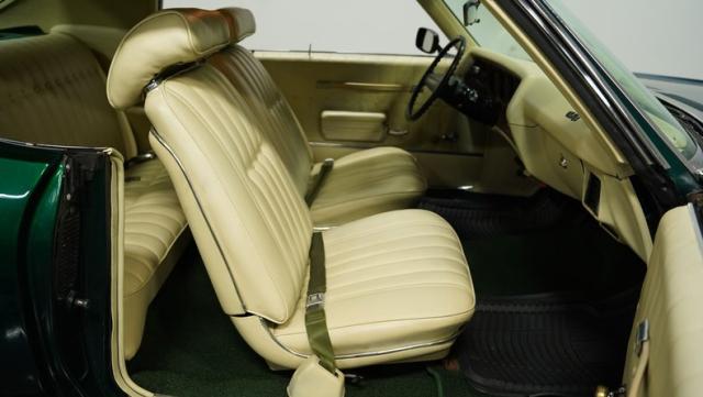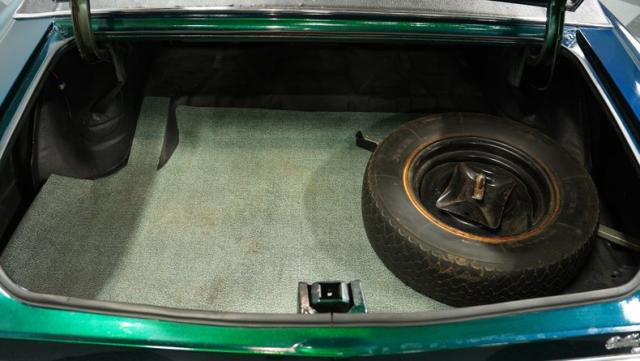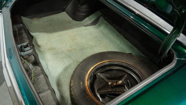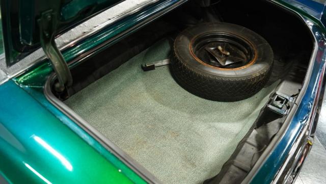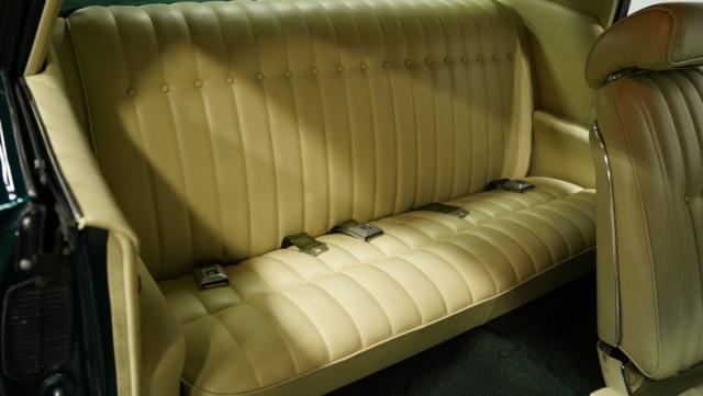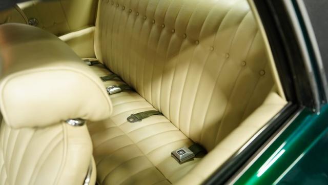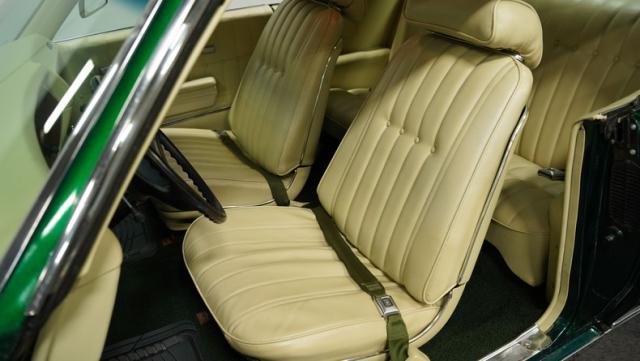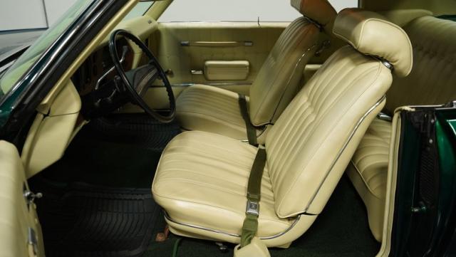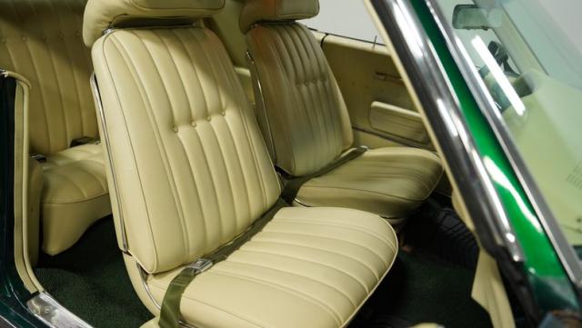 The green theme continues inside, as the original color code for the interior was Jade Vinyl, but it has since been upgraded in both quality and color to a plush set of ivory-colored vinyl bucket seats up front and a bench in the back. The seatbelts, however, do hark back to the original green, keeping this car\'s distinctive tribute to its past going strong, while still looking good.