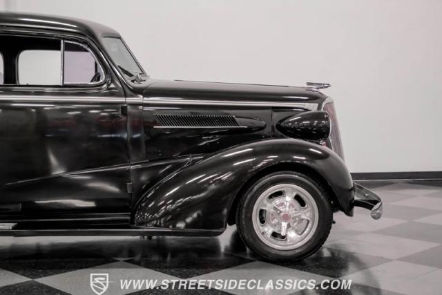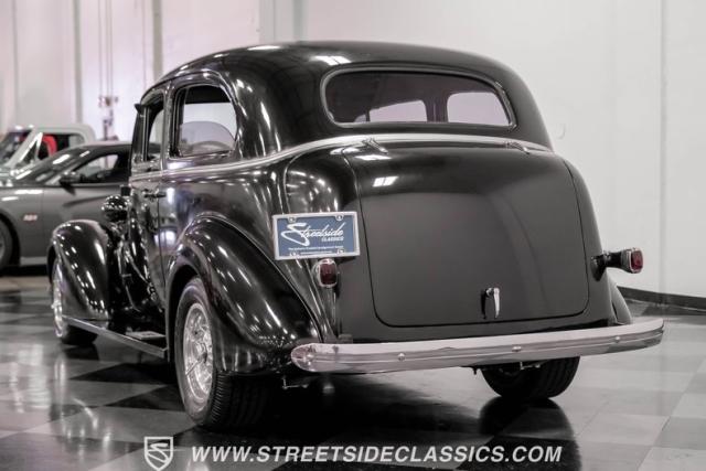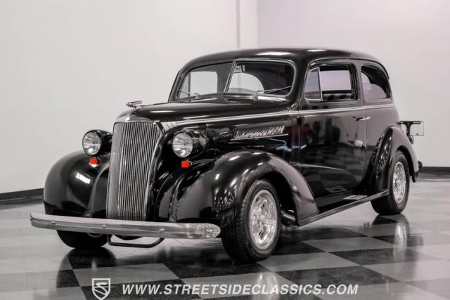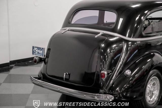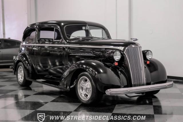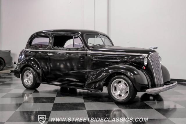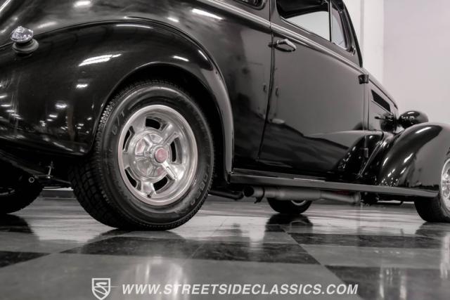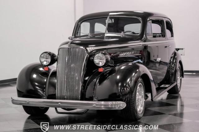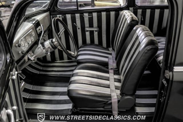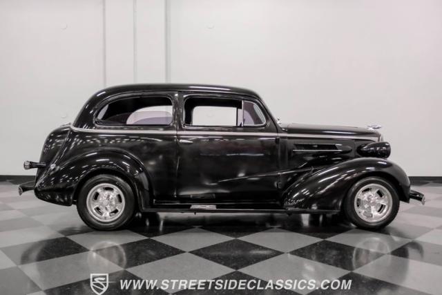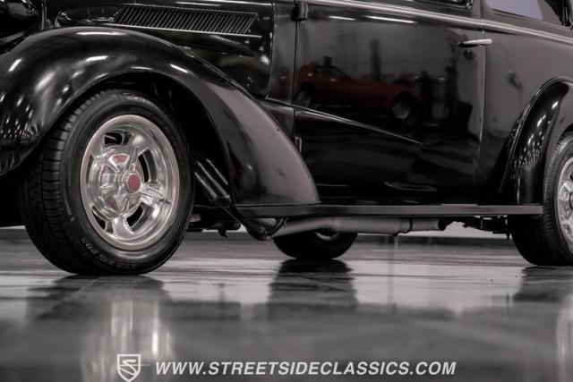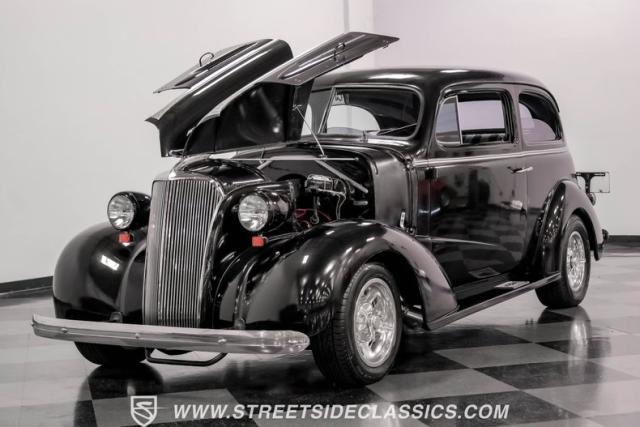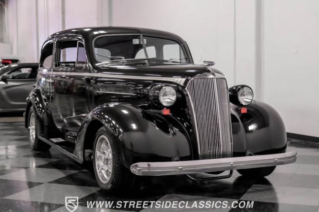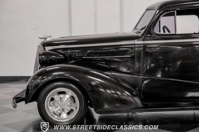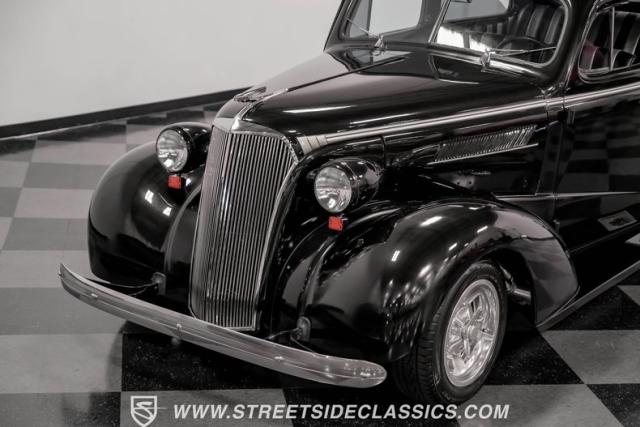 With its classic 1930\'s style, this freshly restored 1937 Chevrolet Master DeLuxe Street Rod is hard not to notice when it pulls up to a gathering of classic cars. Its curvy body is finished in Black Metallic that is set off by a gleaming chrome grill and bumpers. Complementing the look is a set of polished 15-inch Halibrand wheels wrapped with Cooper Cobra Radial G/T tires that are staggered 195/60R15 front and 235/60R15 rear for the perfect street rod stance.