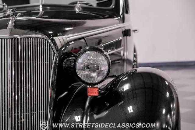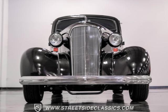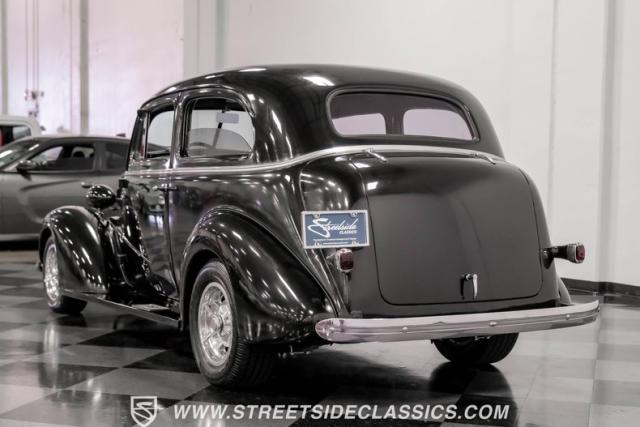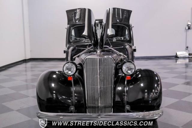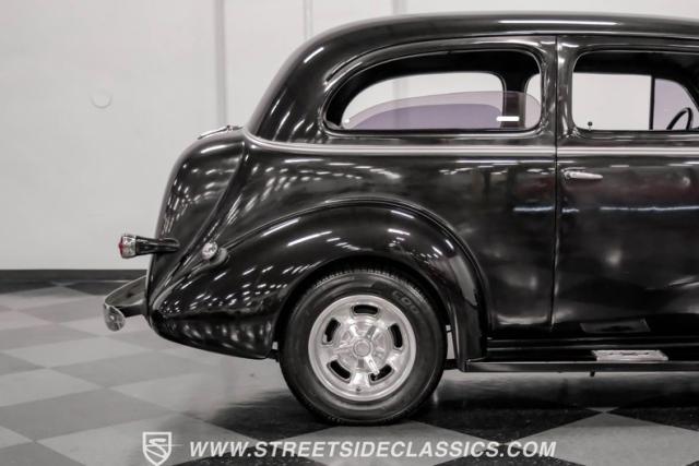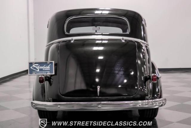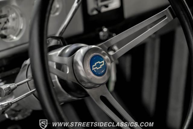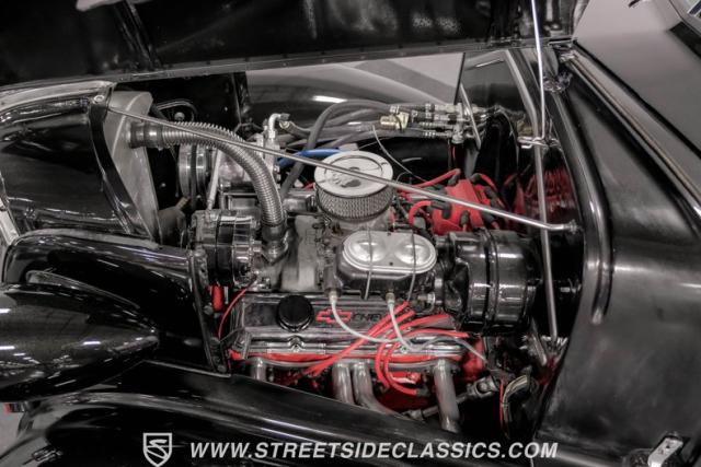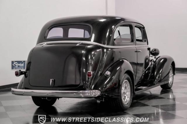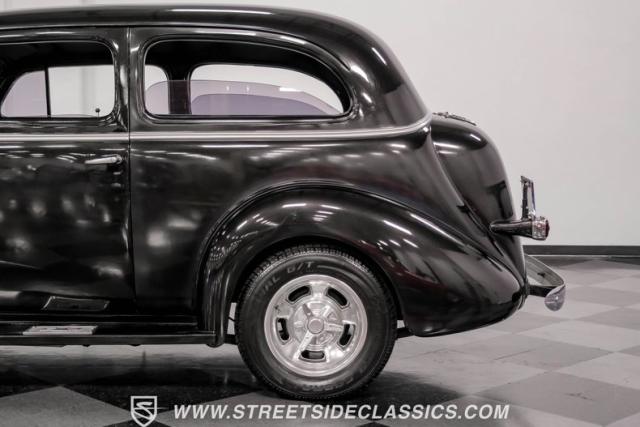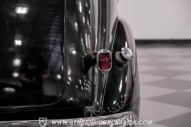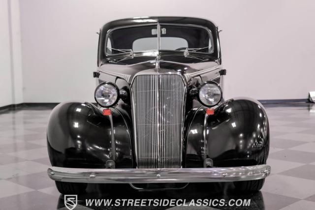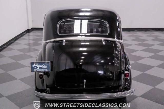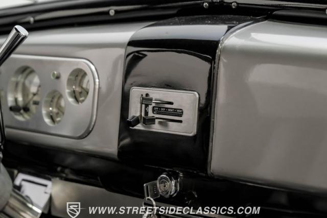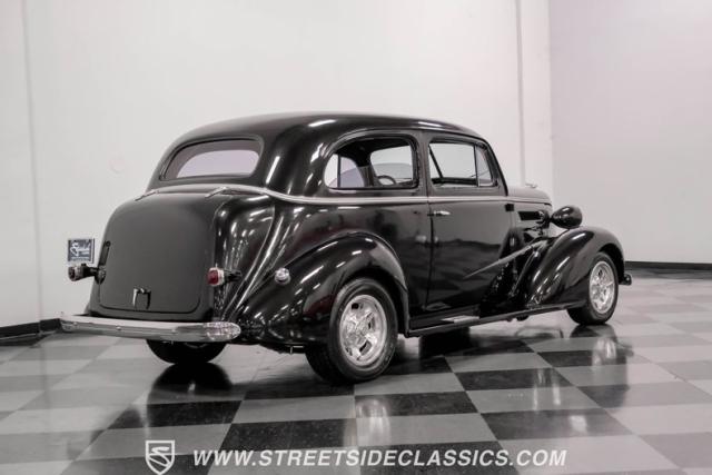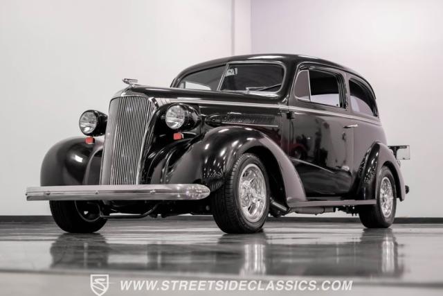 With its classic 1930\'s style, this freshly restored 1937 Chevrolet Master DeLuxe Street Rod is hard not to notice when it pulls up to a gathering of classic cars. Its curvy body is finished in Black Metallic that is set off by a gleaming chrome grill and bumpers. Complementing the look is a set of polished 15-inch Halibrand wheels wrapped with Cooper Cobra Radial G/T tires that are staggered 195/60R15 front and 235/60R15 rear for the perfect street rod stance.