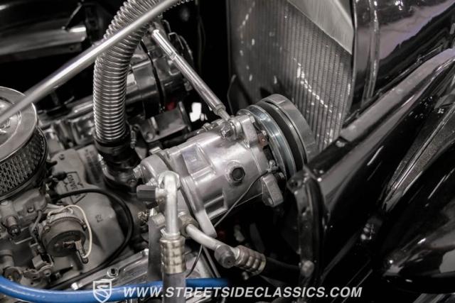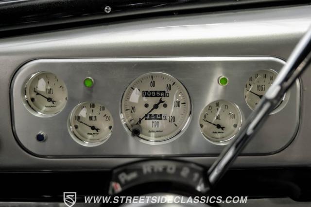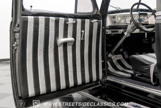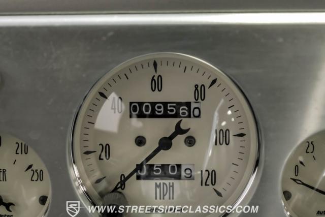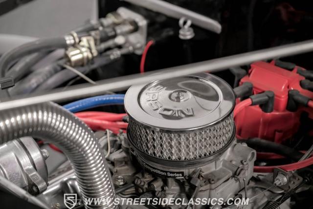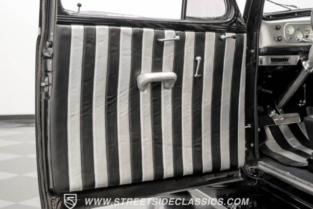 The interior is custom upholstered in a two-tone Silver and Black striped pattern on the front bucket seats, rear seat and door panels, as well as the floor mats. The metal dash is painted silver and has a billet gauge cluster that houses classic-style AutoMeter gauges. Other amenities include seat belts, air conditioning (needs servicing) and an Ididit tilt steering column topped with a custom 3-spoke steering wheel.