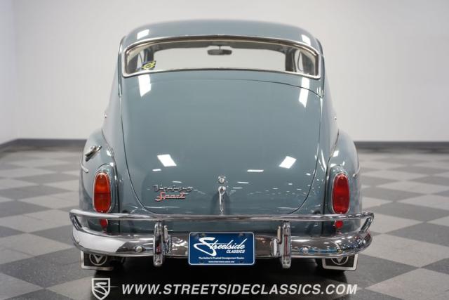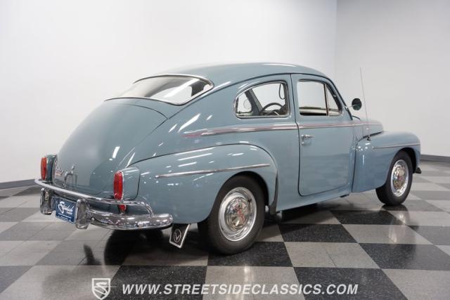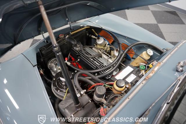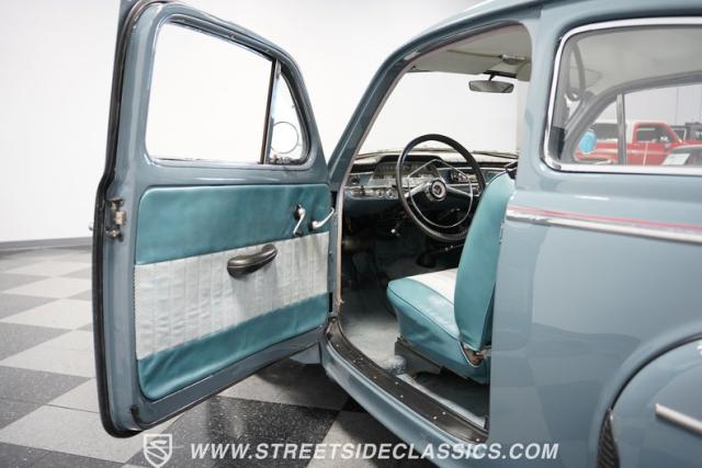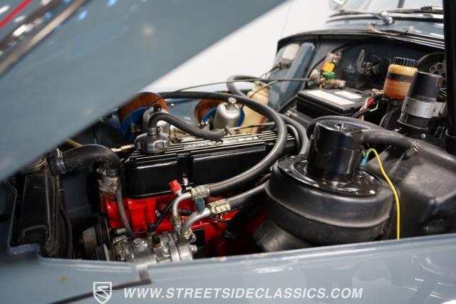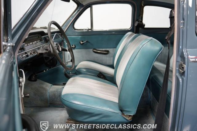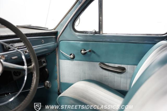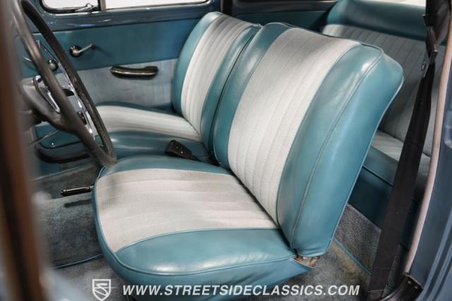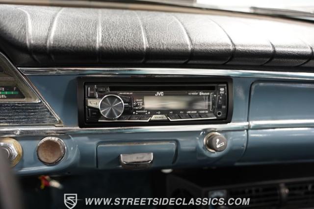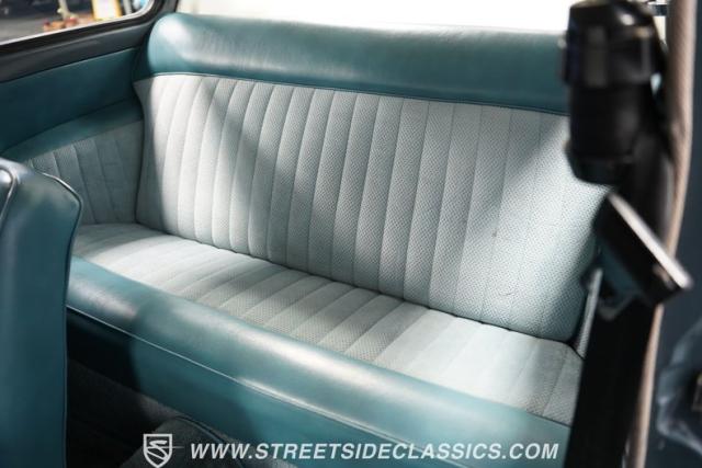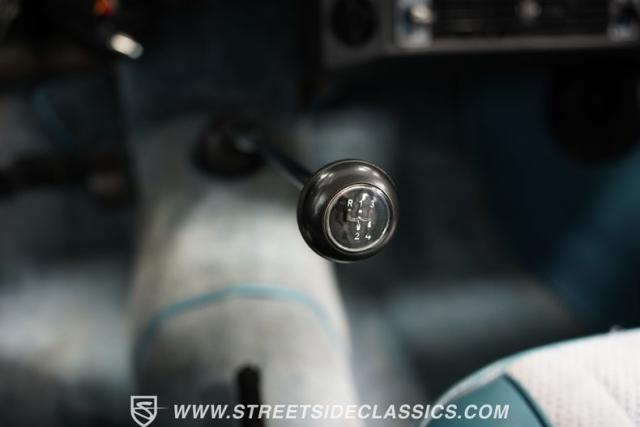 Inside, the light blue and gray interior offers a nostalgic yet fresh atmosphere, with bucket seats in a tasteful mix of vinyl and cloth. The cabin\'s layout is straightforward and uncluttered, echoing the vehicle\'s exterior design philosophy. Equipped with an aftermarket JVC AM/FM single CD stereo with Bluetooth, the audio system modernizes the driving experience without detracting from its vintage charm. A retrofitted air conditioning system ensures comfort during warmer days, making this classic as practical as it is stylish.