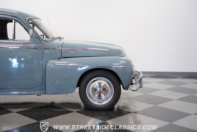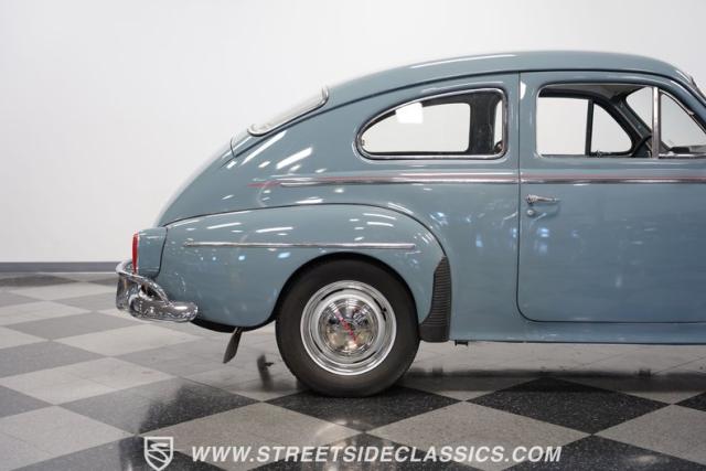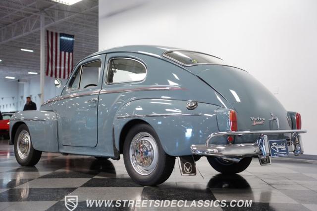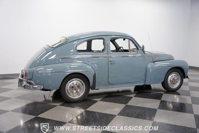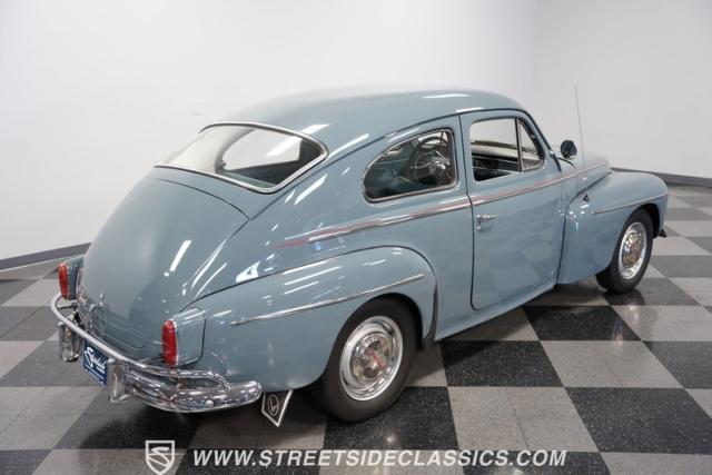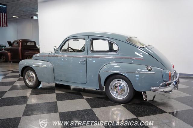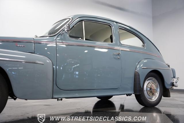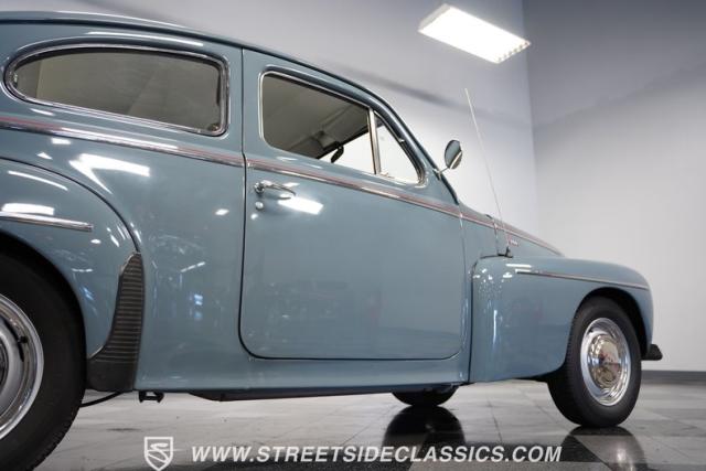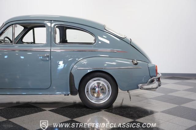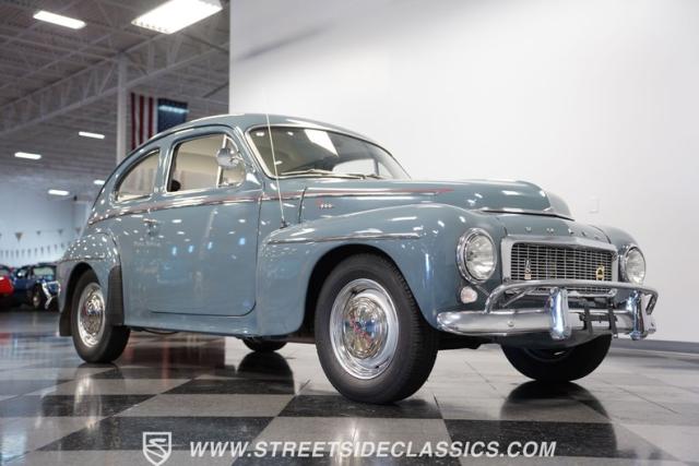 Catching the eye with its sleek blue paint, this 1962 Volvo PV544 is a Scandinavian design and engineering model, embodying a blend of functionality and style. Its exterior has a full repaint in a vibrant shade of blue, complemented by painted steel wheels with chrome beauty rings and center caps wrapped in 165R15 tires. The red pinstriping along its sides adds a dash of flair, contrasting beautifully against the blue body, while its compact, rounded body lines and efficient design hint at the vehicle\'s era without sacrificing a timeless appeal.