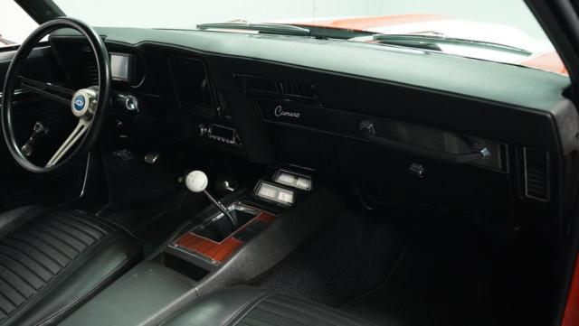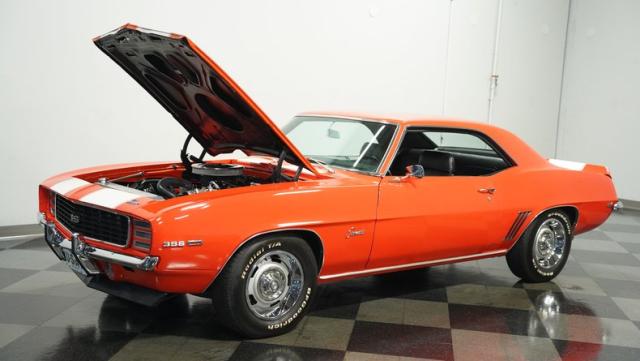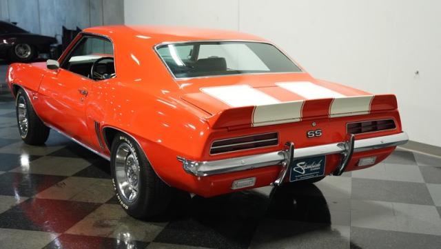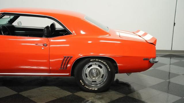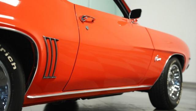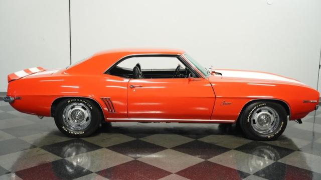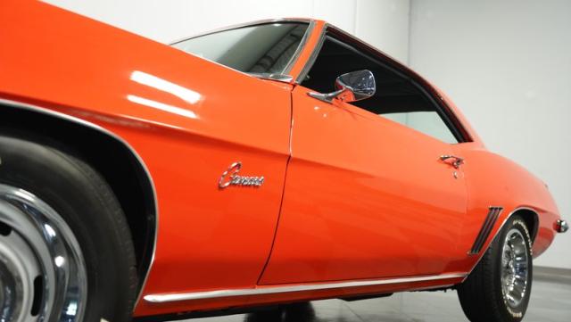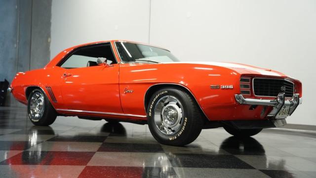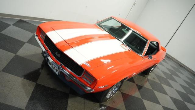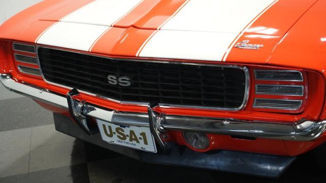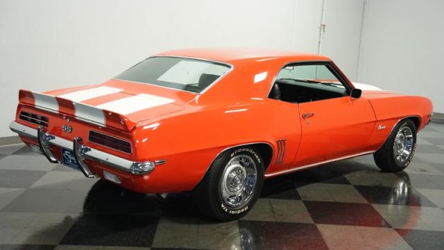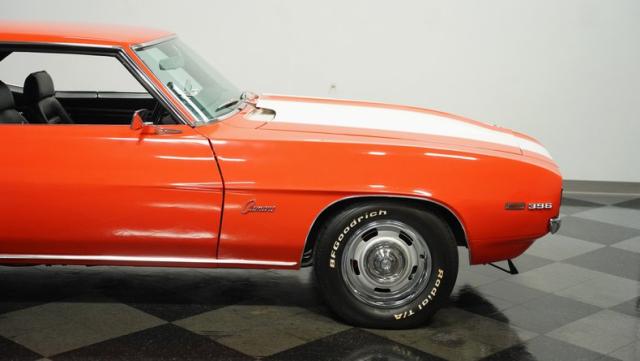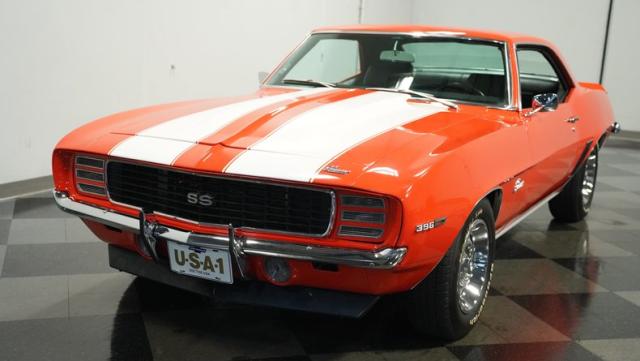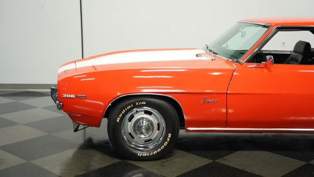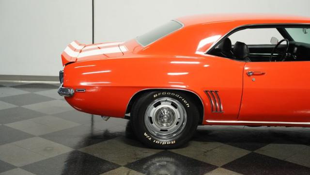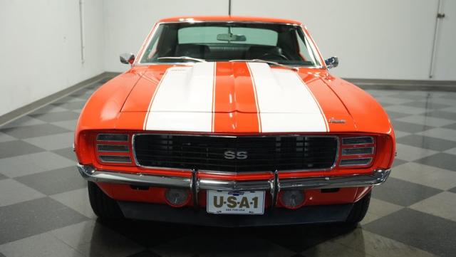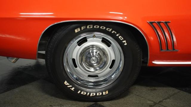 This 1969 Chevrolet Camaro RS/SS 396 Tribute stands out like a beacon of pure muscle car brilliance. Draped in a vivid Hugger Orange hue that\'s as bold as the car\'s performance, this Camaro is a masterpiece of classic American design. The iconic RS hidden headlights, paired with the aggressive cowl hood and crisp white Z/28 racing stripes, create a visual symphony that\'s impossible to ignore. Rolling on period-correct 15-inch wheels wrapped in 215/70R15 tires, this Camaro has a stance that screams power and precision.