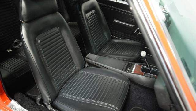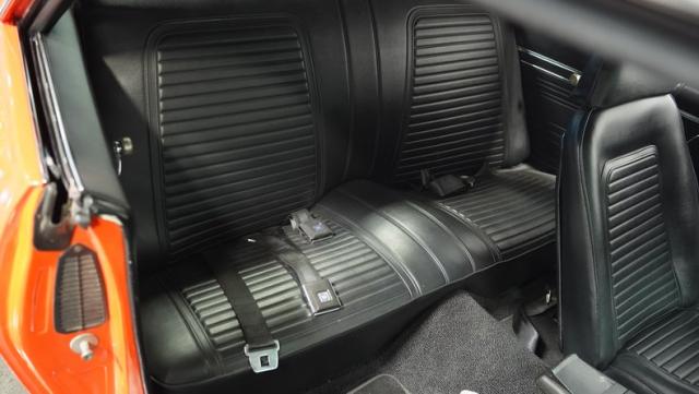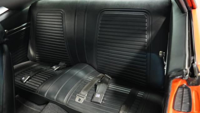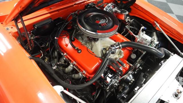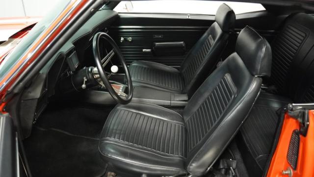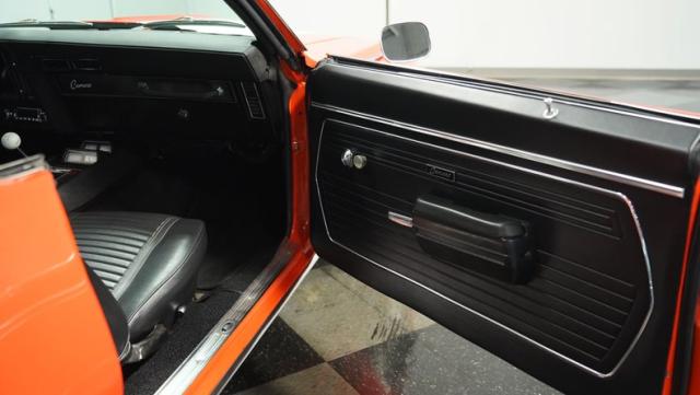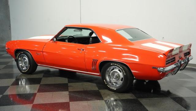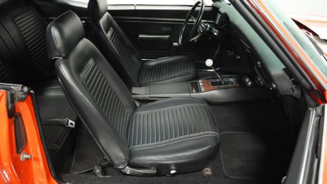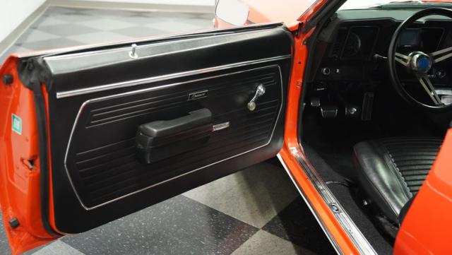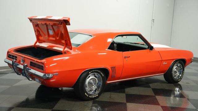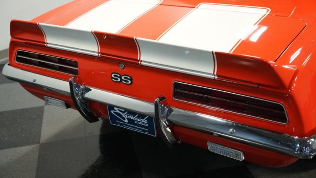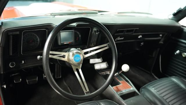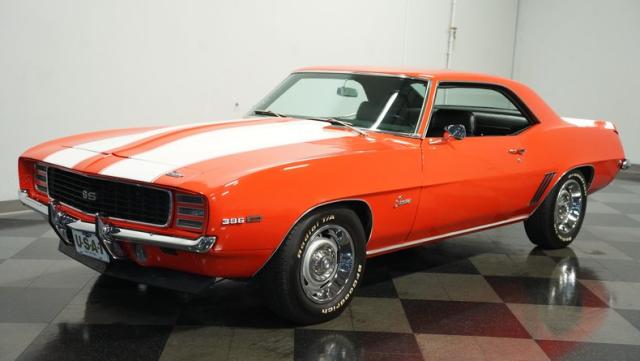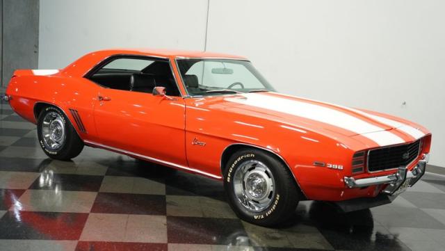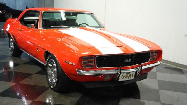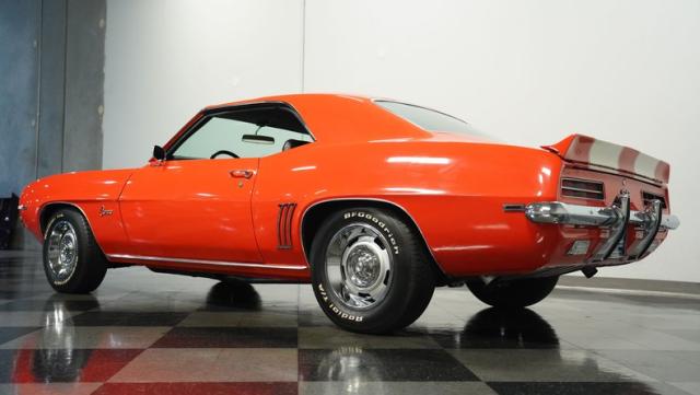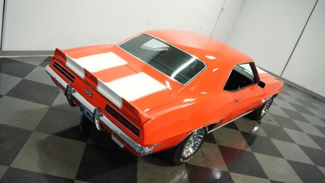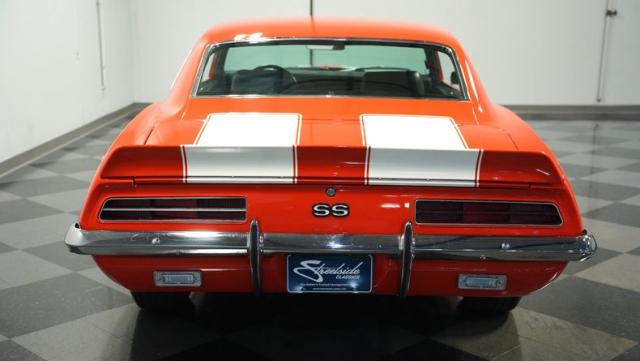 This 1969 Chevrolet Camaro RS/SS 396 Tribute stands out like a beacon of pure muscle car brilliance. Draped in a vivid Hugger Orange hue that\'s as bold as the car\'s performance, this Camaro is a masterpiece of classic American design. The iconic RS hidden headlights, paired with the aggressive cowl hood and crisp white Z/28 racing stripes, create a visual symphony that\'s impossible to ignore. Rolling on period-correct 15-inch wheels wrapped in 215/70R15 tires, this Camaro has a stance that screams power and precision.