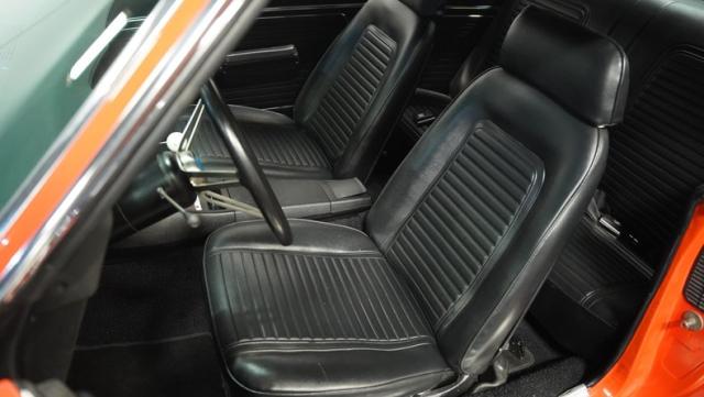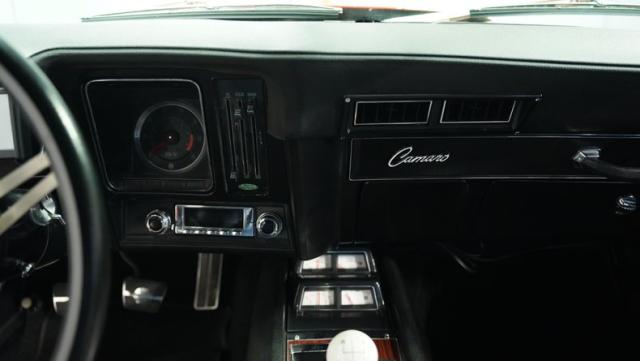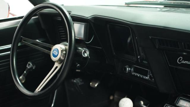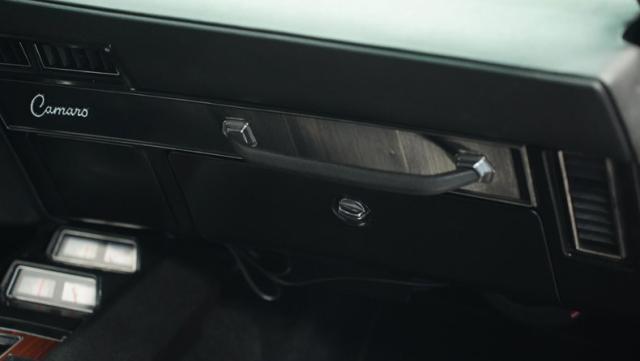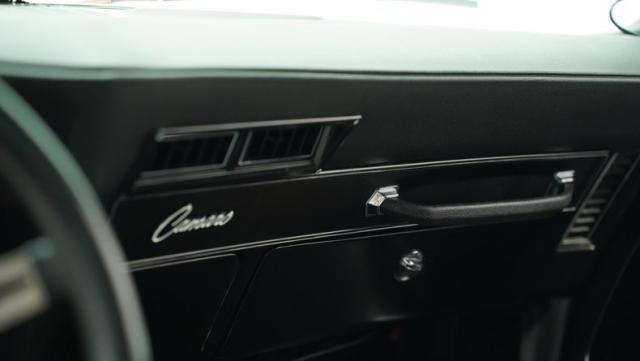 The black vinyl interior is a time capsule of the Camaro\'s racing heritage. Settle into the bucket seats and grip the Hurst shifter, ready to take control of the big block V8. The retro-sound radio and Vintage Air controls integrate seamlessly with the auxiliary gauges in the center console, creating a driver-focused cockpit. The headliner is taut, and the door and window trim gleam with a luster that reflects the car\'s meticulous restoration.