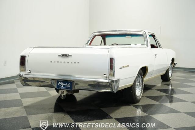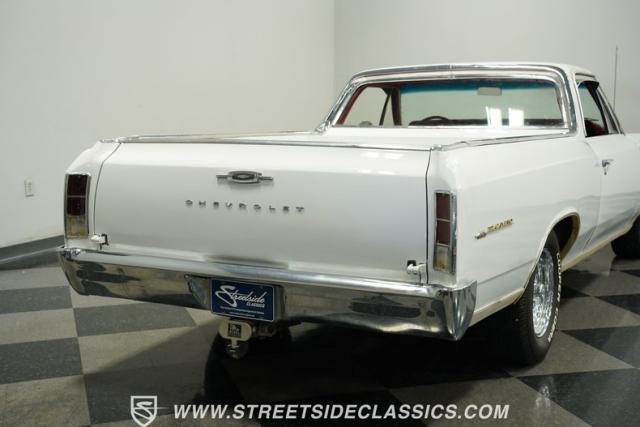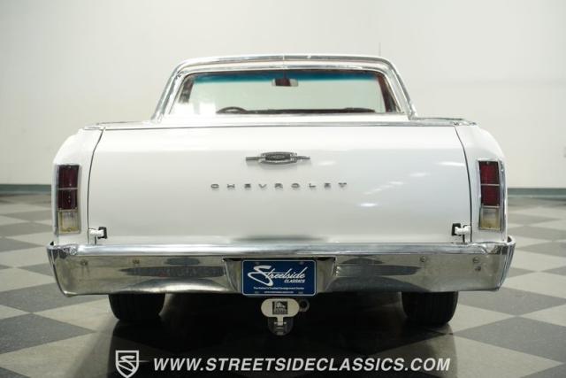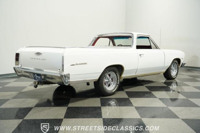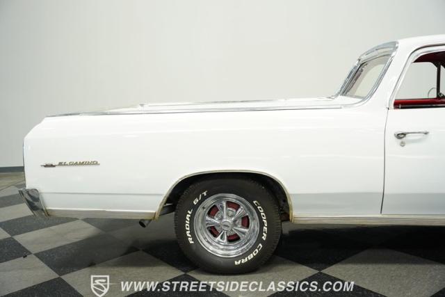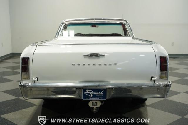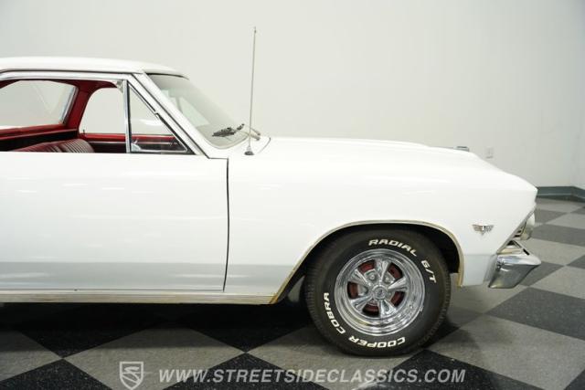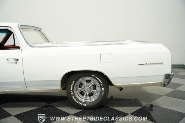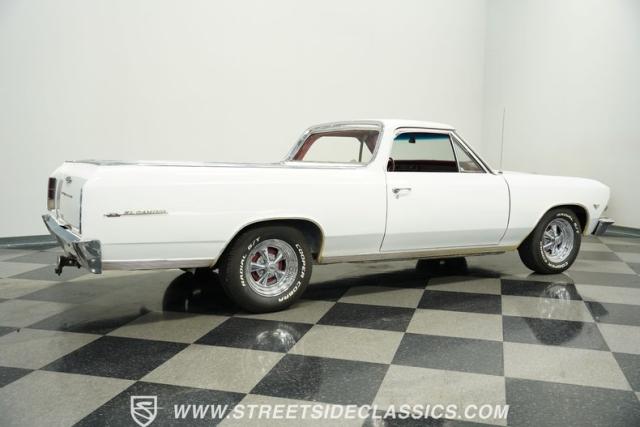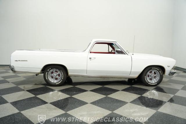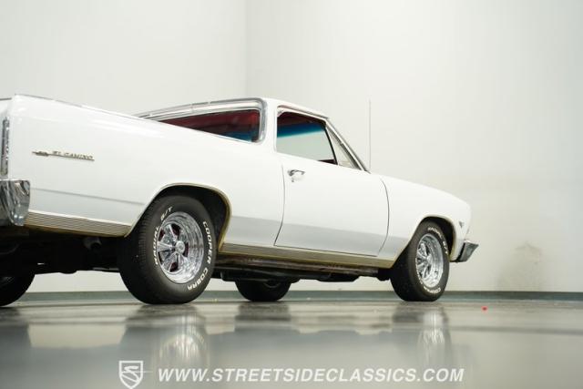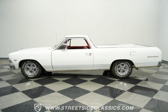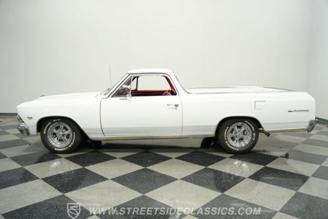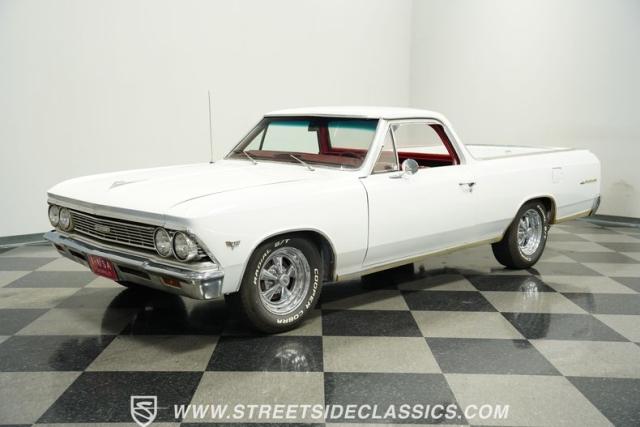 Sleek lines and classic proportions make the 1966 Chevrolet El Camino instantly recognizable in its crisp Ermine White finish. The long body creates an unmistakable profile that has maintained its appeal for decades. Chrome trim accents the front grille and surrounds the windows, providing perfect contrast against the white paint. The 15\" Cragar wheels fill out the wheel wells with P215/70R15 front and P225/70R15 rear tires mounted for proper stance. Dual exhaust exits complete the rear view with a performance-minded aesthetic.