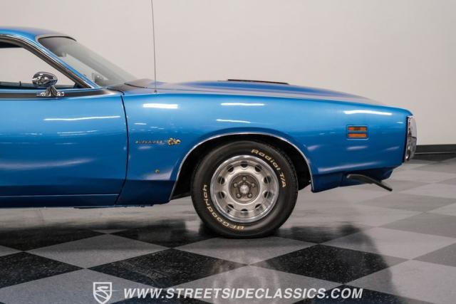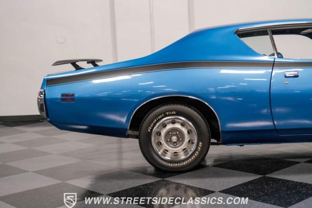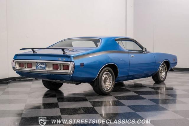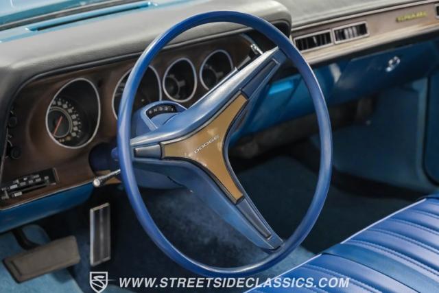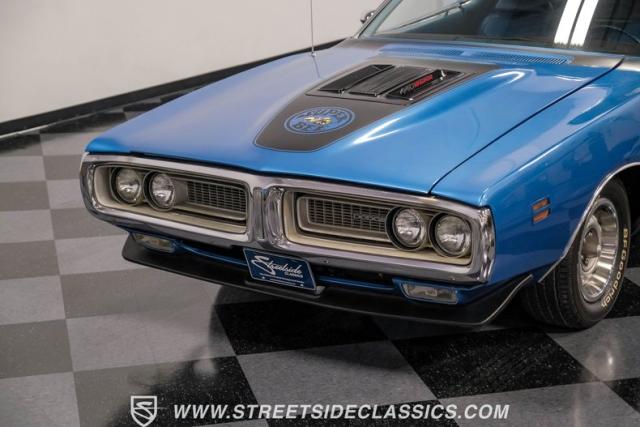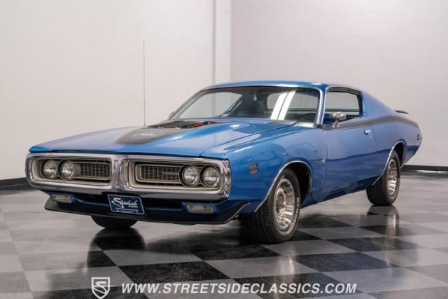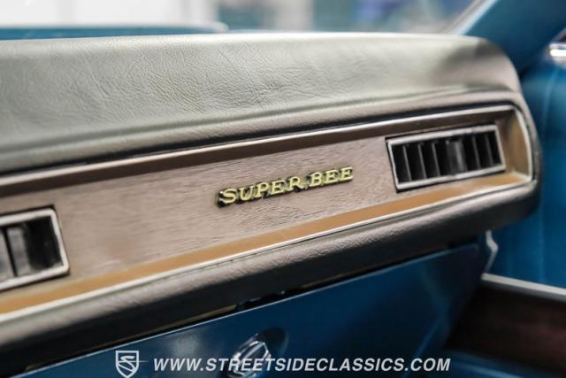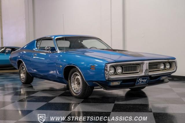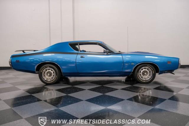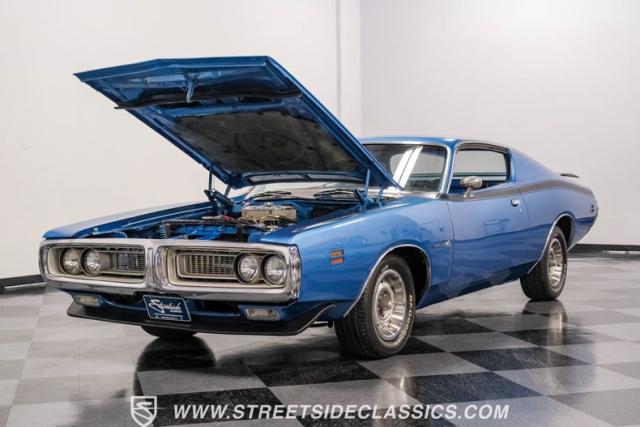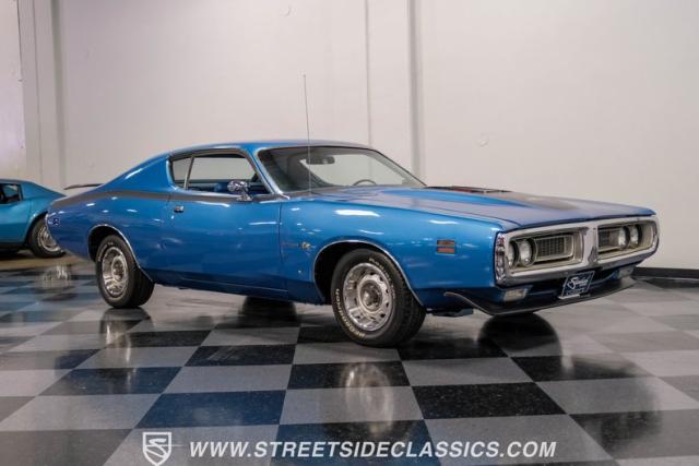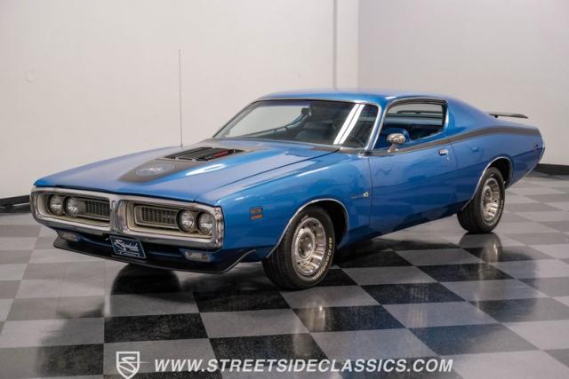 This 1971 Dodge Charger Super Bee, one of fewer than 5,100 believed to have been built, showcases Mopar\'s final year of the vaunted Super Bee name (before it was resurrected some 35 years later). The blue exterior, accented by black stripes, exemplifies the distinctive fuselage styling, with a power bulge hood and 440 Magnum and Super Bee emblems announcing its performance credentials. Front and rear spoilers enhance its aggressive profile and factory 15-inch wheels with beauty rings and 235/60R15 tires ground this powerhouse.