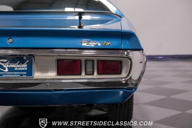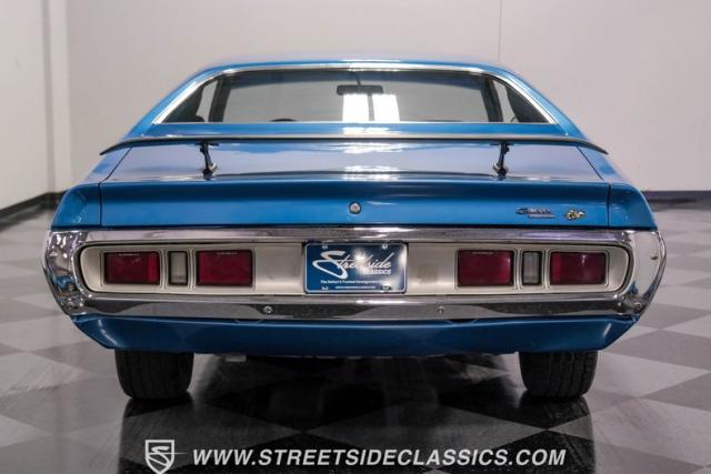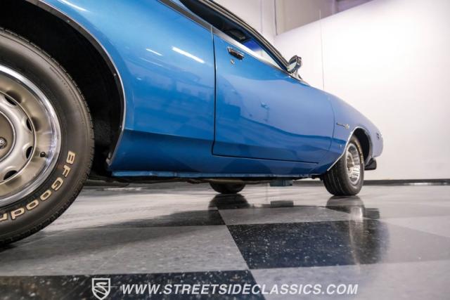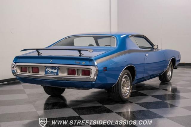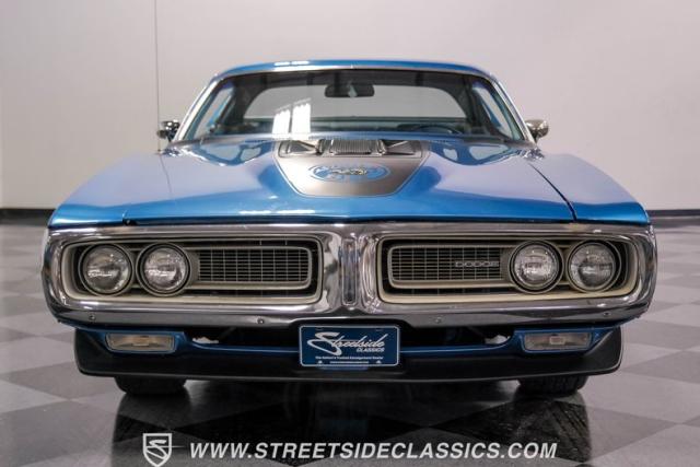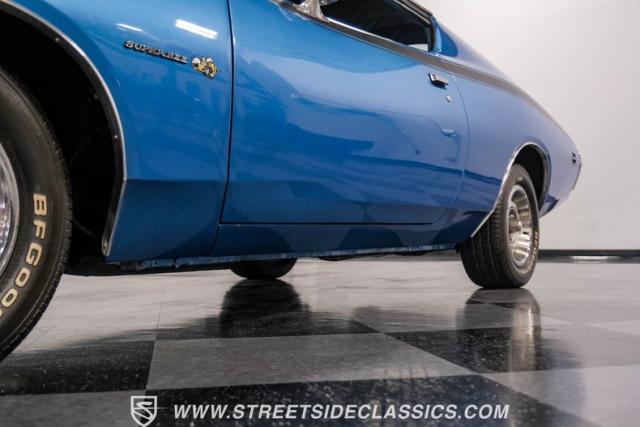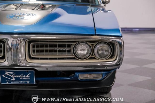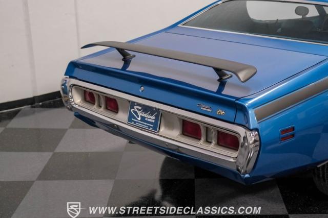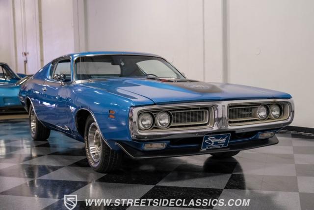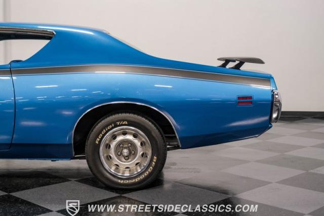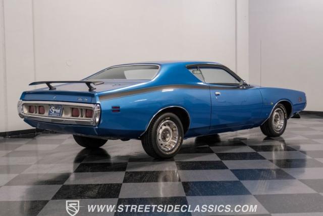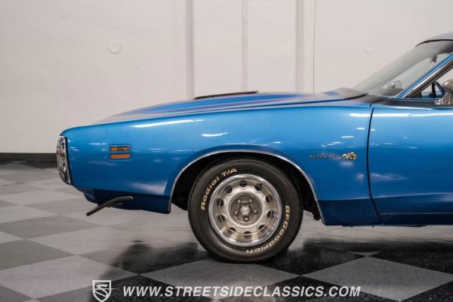 This 1971 Dodge Charger Super Bee, one of fewer than 5,100 believed to have been built, showcases Mopar\'s final year of the vaunted Super Bee name (before it was resurrected some 35 years later). The blue exterior, accented by black stripes, exemplifies the distinctive fuselage styling, with a power bulge hood and 440 Magnum and Super Bee emblems announcing its performance credentials. Front and rear spoilers enhance its aggressive profile and factory 15-inch wheels with beauty rings and 235/60R15 tires ground this powerhouse.