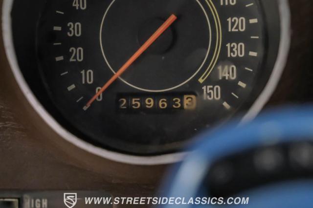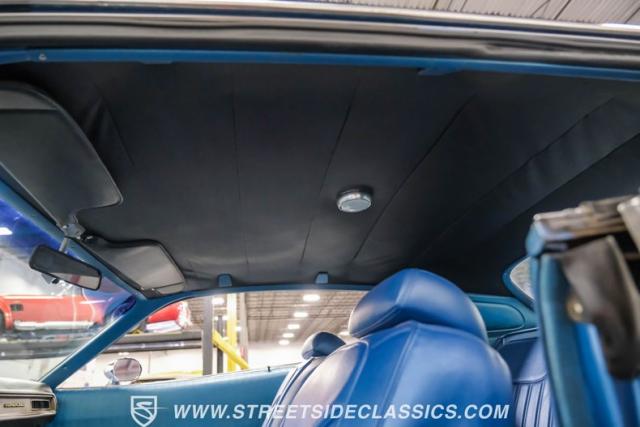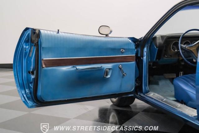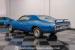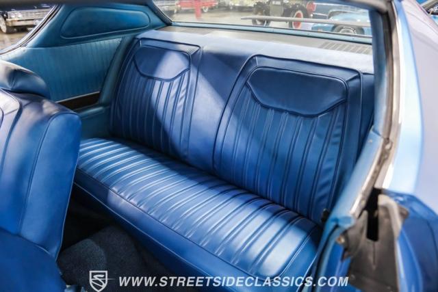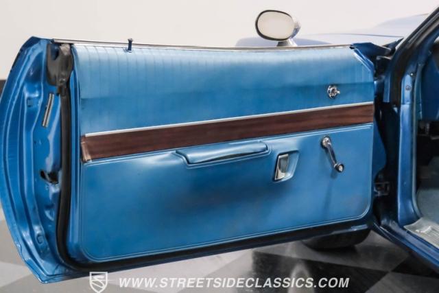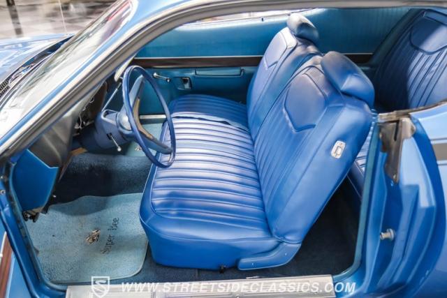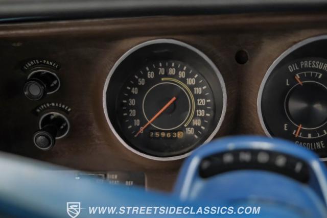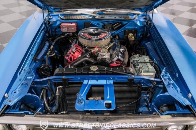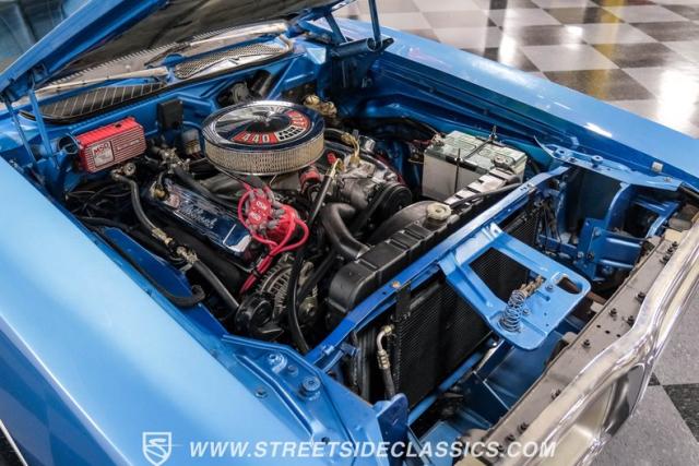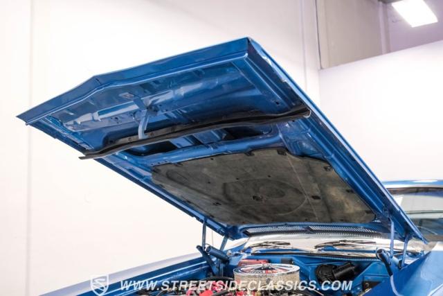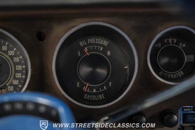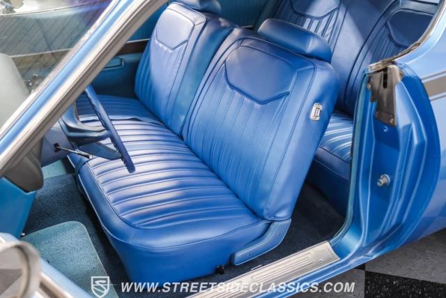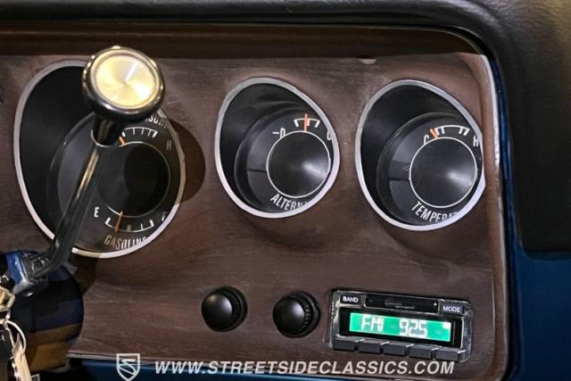 Blue vinyl covers the bench seats, matching the exterior\'s bold color scheme. The column shifter and clean dashboard layout emphasize the car\'s performance focus. An AM/FM/AUX stereo provides audio options, while power steering eases maneuverability. Aftermarket air conditioning offers modern comfort, blending vintage appeal with contemporary convenience.