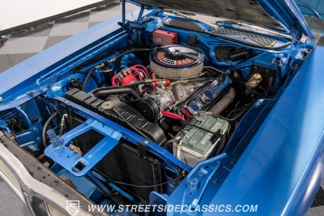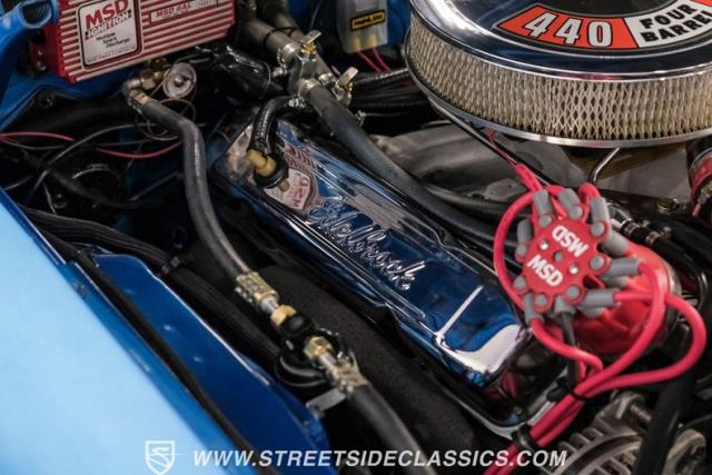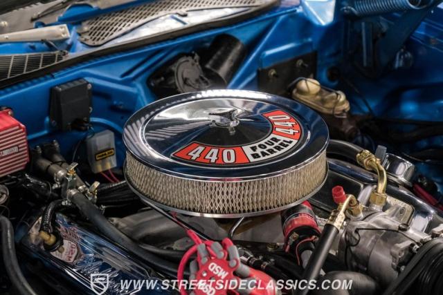 The 440 V8 engine, an upgrade from the original 383, dominates the engine bay. Chrome valve covers and breather add visual flair. An Edelbrock Torker aluminum intake manifold feeds a dual-line Holley carburetor, optimizing fuel delivery. The MSD ignition system ensures consistent performance. Drum brakes at all four corners maintain period-correct stopping power while power steering makes handling a breeze. The A727 Torqueflite 3-speed automatic transmission handles gear changes, balancing cruising comfort with quarter-mile capability.