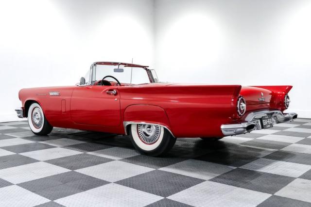 Finished in iconic Flame Red, this convertible wears its jet age curves proudly. The longer rear deck, reshaped front bumper, and subtle fins distinguish the 1957 model from earlier cars, making it the most desirable of the early Birds. Dual exhaust adds the right soundtrack, while classic Thunderbird proportions ensure it looks just as good parked as it does cruising.