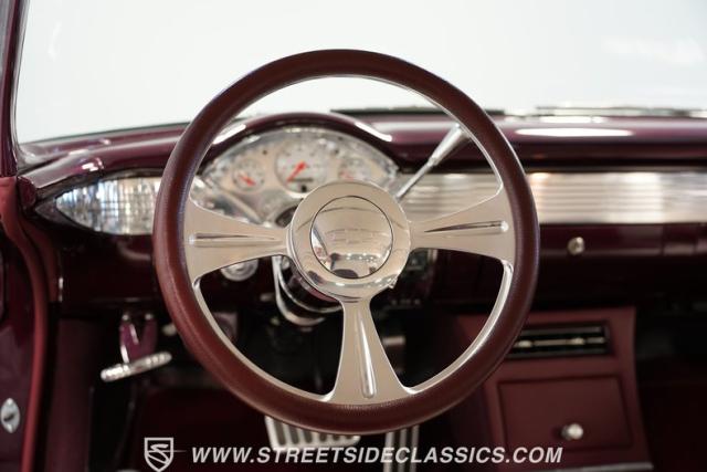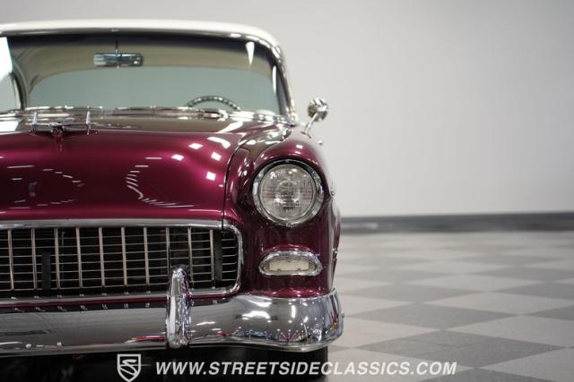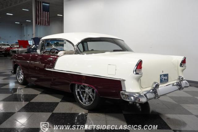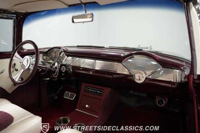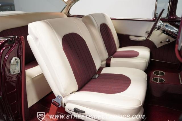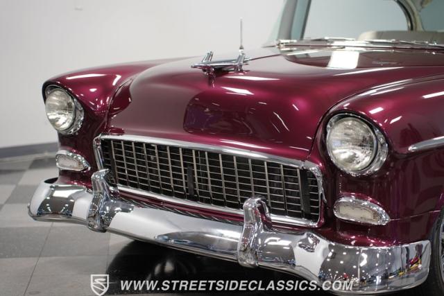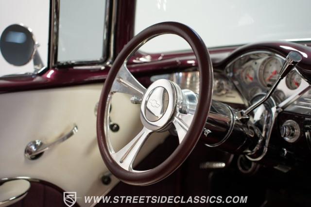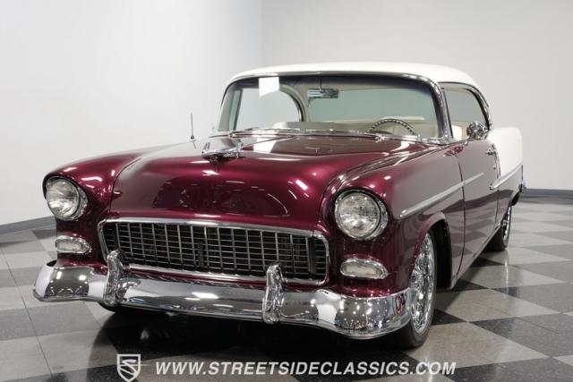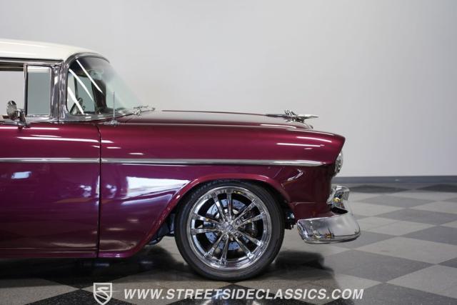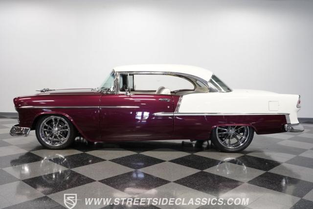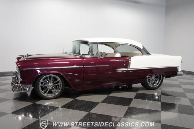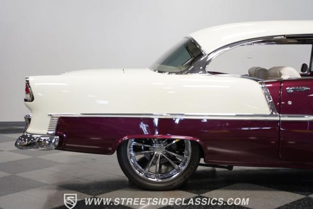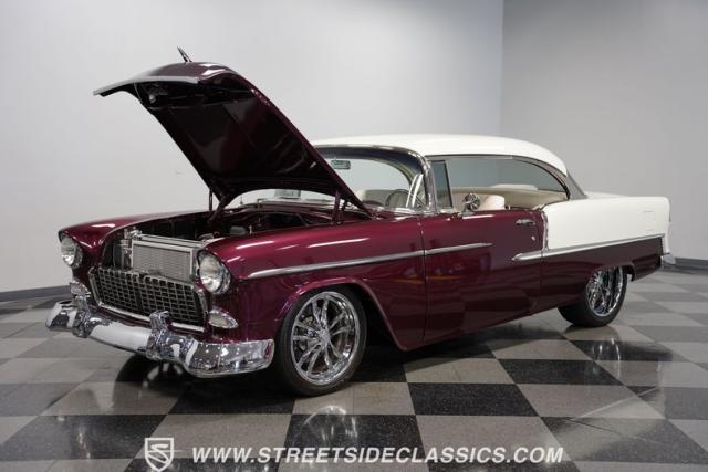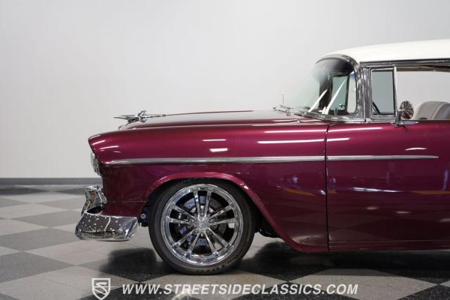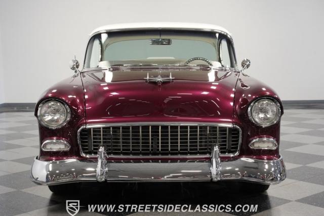 Built by American Resto, this 1955 Chevrolet Bel Air showcases a deep plum purple finish with a metal flake that flows across straight panels, contrasting brilliantly with white accents. U.S. Mags wheels enhance the classic lines - 18-inch up front and 20-inch in the rear, wrapped in 215/45R18 front and 255/45R20 rear performance tires. A 2-inch drop using Heidt\'s spindles gives this Bel Air an authoritative road presence, while dual MagnaFlow exhausts exit cleanly beneath the rear bumper.