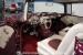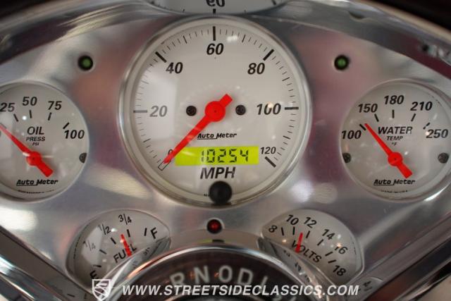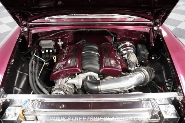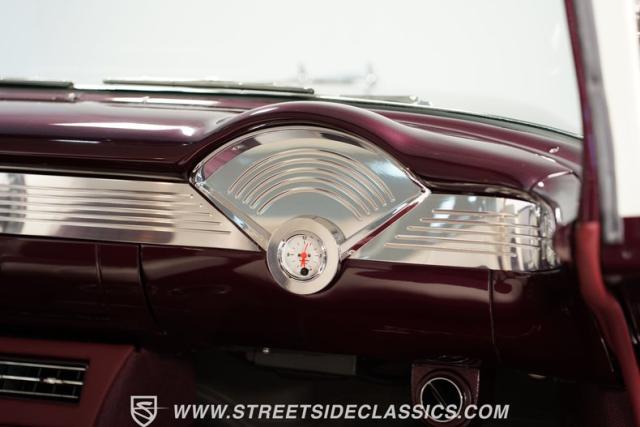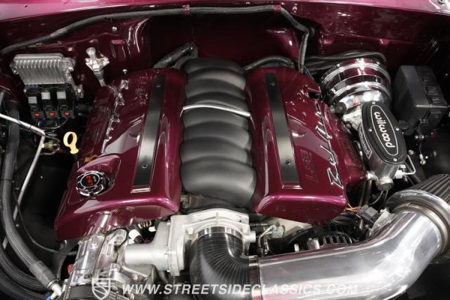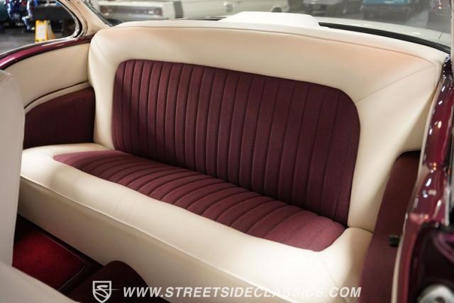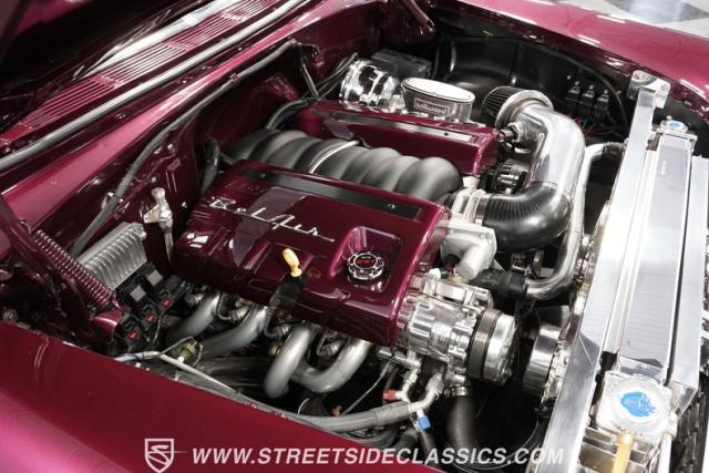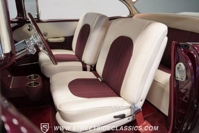 The custom purple and white interior brings modern luxury to the classic design. Leather bucket seats provide ideal positioning behind the column shifter, while Auto Meter gauges relay vital information through the custom dash. A purpose-built center console anchors the cabin, complementing custom door cards and rear panels. The AM/FM/AUX stereo system adds entertainment value, while power windows, air conditioning, and power steering deliver everyday usability.