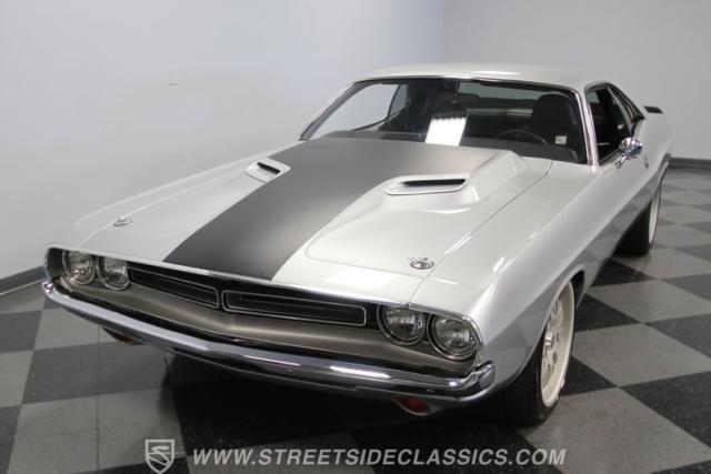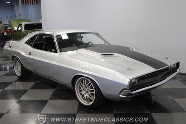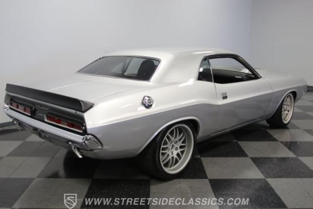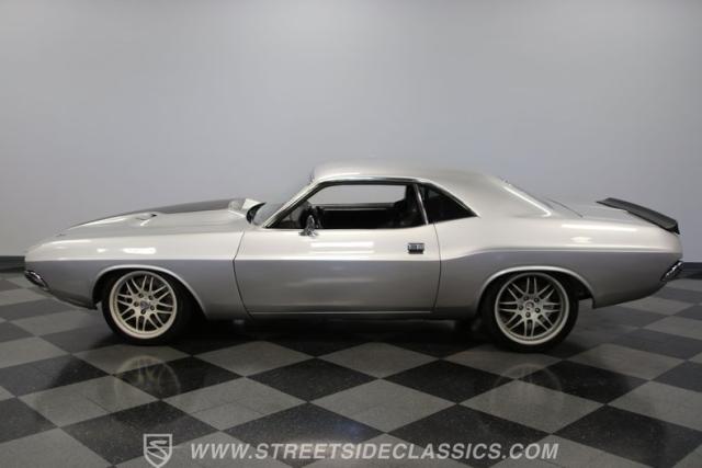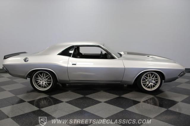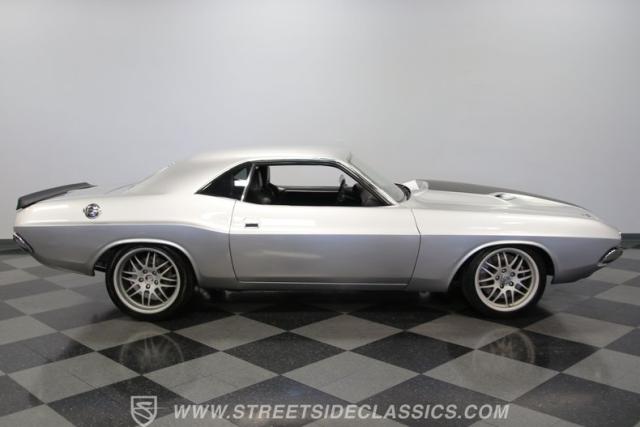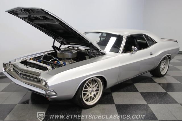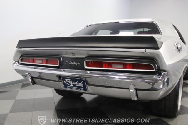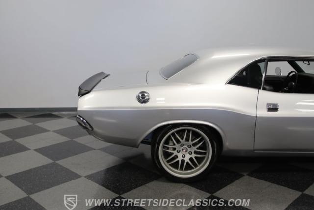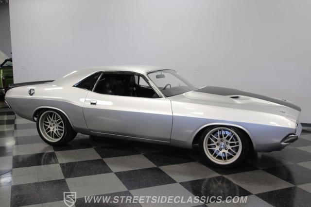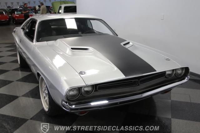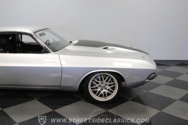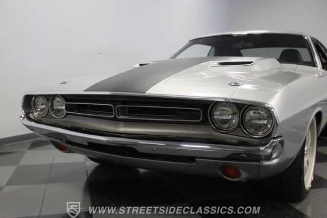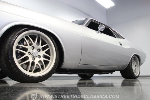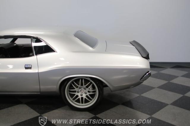 The story we\'re told is that this has only about 1k miles on it since it\'s full restoration. Just looking down the bright, shiny flanks of this Challenger, you can see that the money was spent wisely. Panel fit and body gaps show an attention to quality, which makes for the best canvas around. So the silver paint looks like it was applied over truly precious metal. The shine gives extra definition to the full-length body crease, and so it gives this coupe a true look that\'s equal parts fast and class. It\'s nicely detailed with the black hood stripe coordinating with the rear spoiler. And Mopar fans will pick up on subtle details, like how this one has the front end of the \'71 car so that the chrome bumper hugs the form better. Other upgrades are more obvious and hint at the big upgrades in power. So those modern alloys allow you to fit modern sport tires, and the larger power bulge in the hood let\'s everyone know there\'s a beast within.