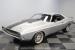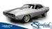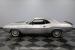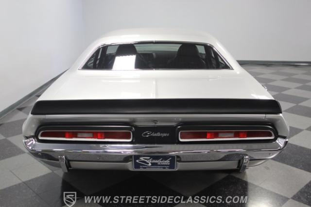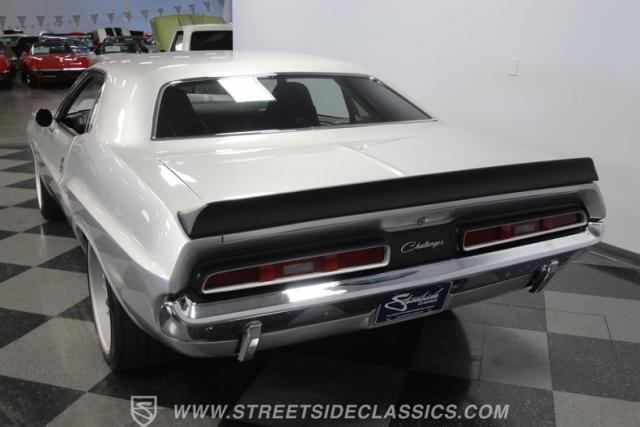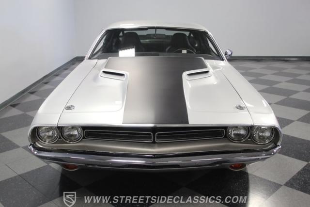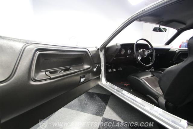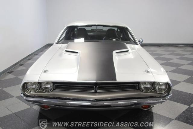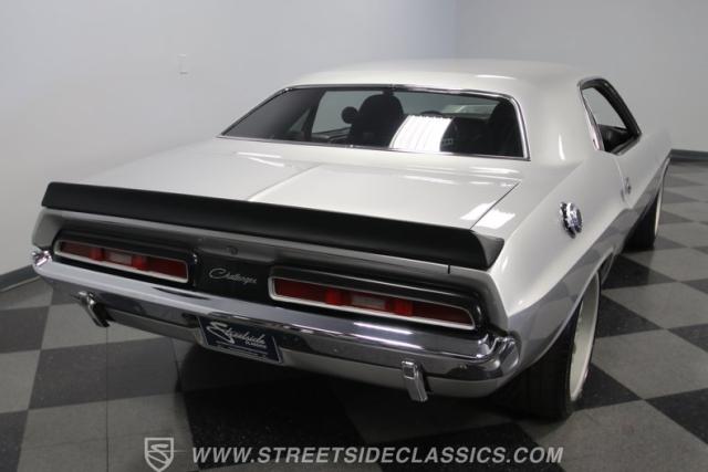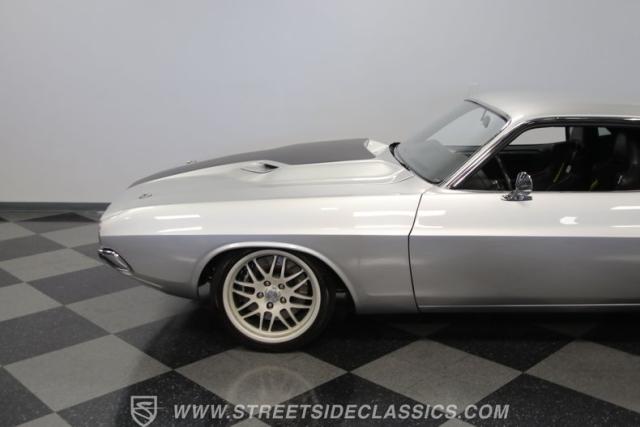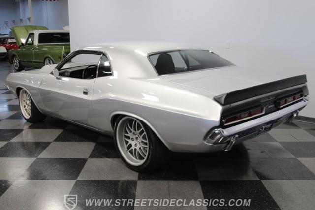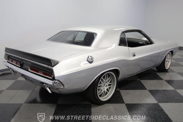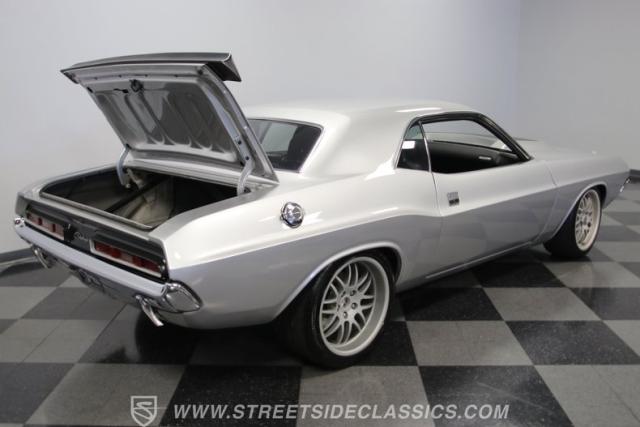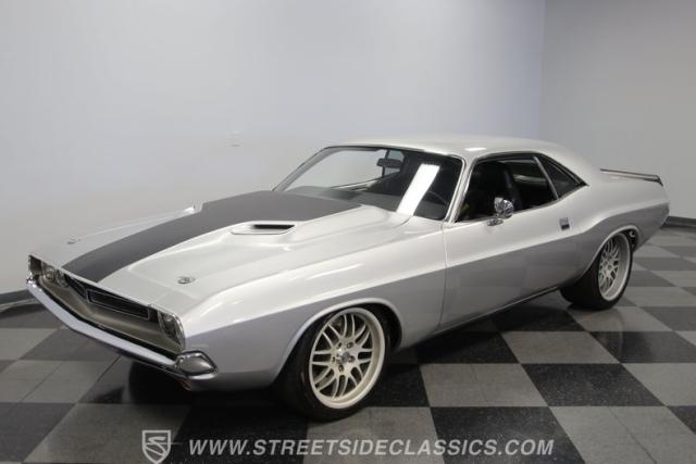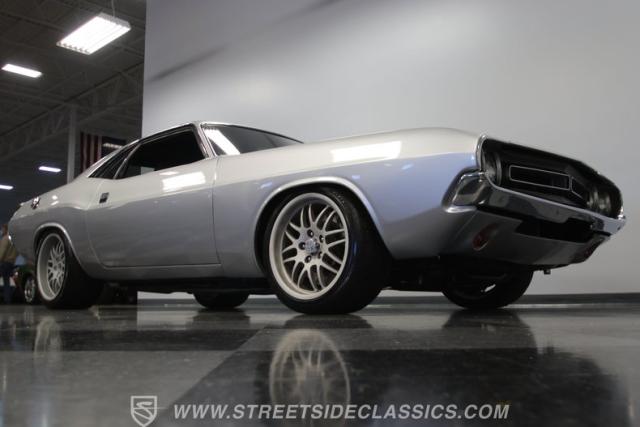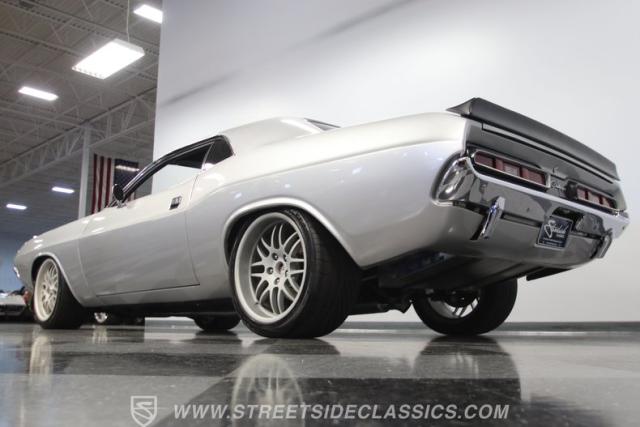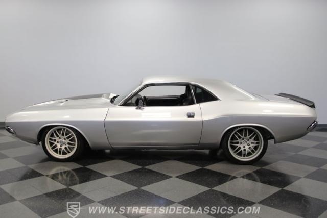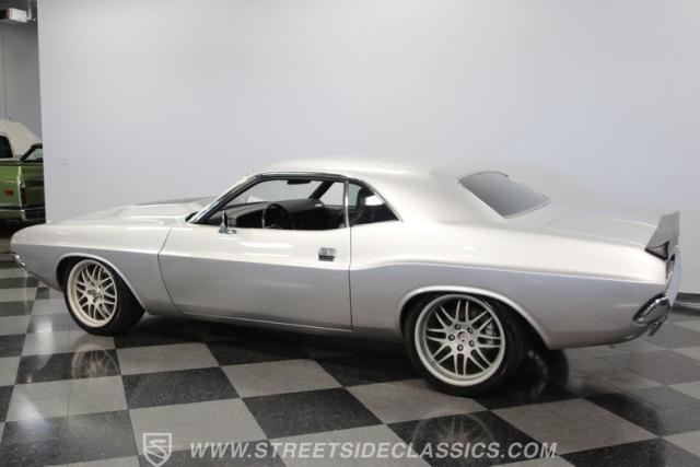 The story we\'re told is that this has only about 1k miles on it since it\'s full restoration. Just looking down the bright, shiny flanks of this Challenger, you can see that the money was spent wisely. Panel fit and body gaps show an attention to quality, which makes for the best canvas around. So the silver paint looks like it was applied over truly precious metal. The shine gives extra definition to the full-length body crease, and so it gives this coupe a true look that\'s equal parts fast and class. It\'s nicely detailed with the black hood stripe coordinating with the rear spoiler. And Mopar fans will pick up on subtle details, like how this one has the front end of the \'71 car so that the chrome bumper hugs the form better. Other upgrades are more obvious and hint at the big upgrades in power. So those modern alloys allow you to fit modern sport tires, and the larger power bulge in the hood let\'s everyone know there\'s a beast within.