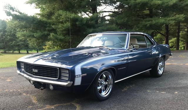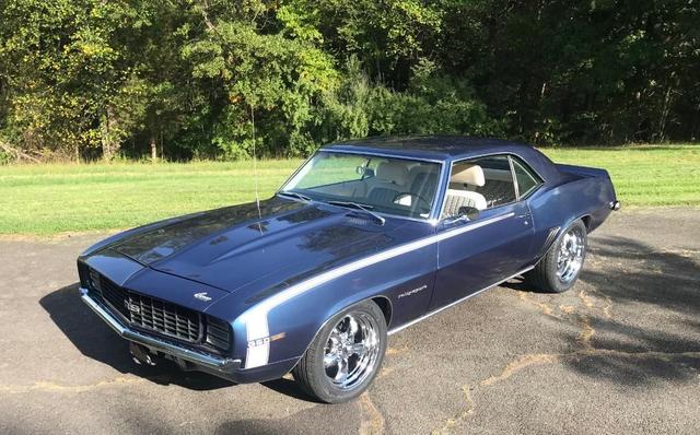 969 Camaro Rally Sport hardtop with 350 cubic inch aluminum head LT1 engine with automatic transmission, (turbo 400) and 12 bolt positraction rear end. A loaded up Rally Sport with power steering, power disc brakes, factory air conditioning, bucket seats with console and gauges, factory tachometer, complete new deluxe interior with houndstooth inserts, AM-FM stereo radio, fifteen inch rally wheels, tinted glass, cowl induction hood, spoilers, aluminum intake manifold with Holley four barrel carb. The Rally Sport package includes all exterior decor chrome, hideaway headlights, wheel opening moldings, roof drip moldings, special tail lights, and back up lights below the rear bumper. This car has a high quality paint job finished in factory Dusk Blue with white hockey stick stripes, and a new deluxe interior in pearl white. Body is super straight, and all chrome work has been replaced, including emblems, moldings, and weatherstripping. This is an impressive running car and super good looker.