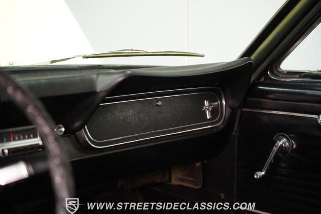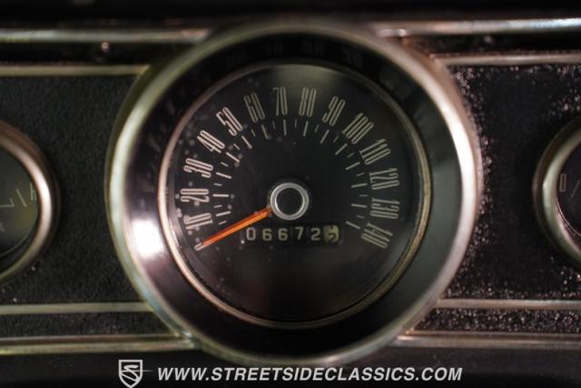 Inside, we find an original-looking black vinyl interior. A three-spoke wheel showcases a Mustang center cap, positioned just ahead of a five-pod gauge cluster that features a big center-mounted 140 mph speedometer. Sliding HVAC controls keep things easy, while the original-looking AM radio helps this Pony Car retain its classic vibe.