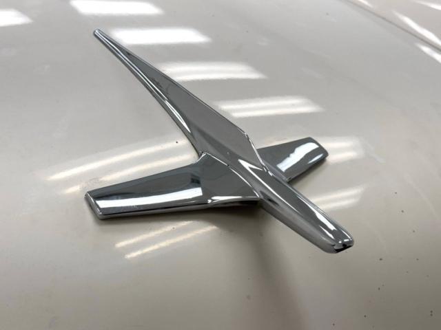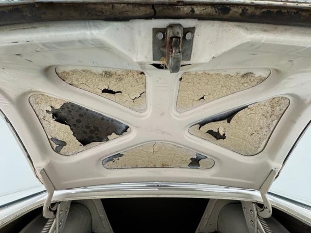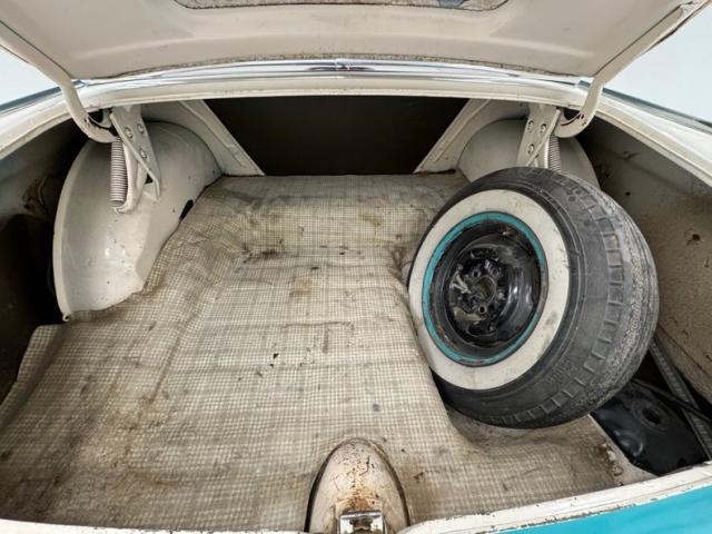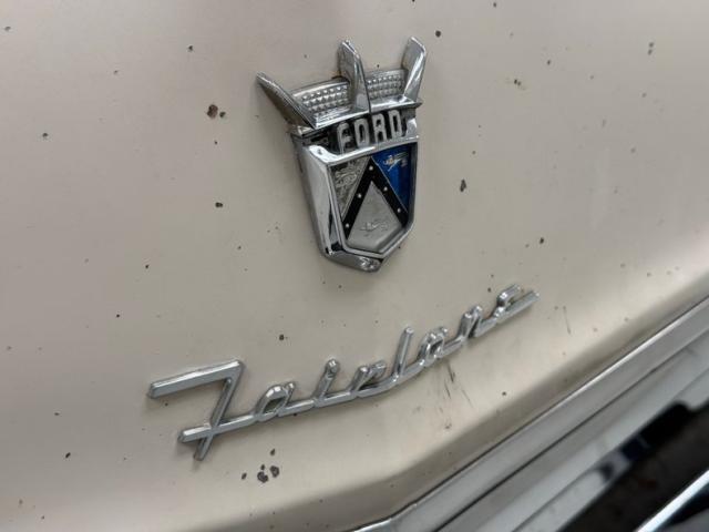 We are treated to straight steel panels, well minded gaps, and wonderful 2 tone Mountain Green with Snowshoe White paint scheme. Breaking up and highlighting the panels are shiny and mirror-like nuggets of chrome trimmings and big multi-level bumpers on front and back. Atop the hood is a jet ornament, which was definitely the theme of times to come. Just below is a perfect cloisonn Ford shield badge. On the front quarter are the beginnings of the iconic swoop spear which starts just above the headlights, and runs towards the mid door where it takes a dive downward then levels off to trim the delineation between the green and white. Large chrome surrounds for the windows and on the rear B pillar a wide wrap trim, which thins out and runs to the end of the car on top of the rear fenders. On back, 2 simple round tail lights with a pointed backup triangular shaped backup light just above. The green covers the lowers and sides as well as the roof of the car, and the white is on the hood, upper sides and trunk. What a great combo. The body panels do show some rust bubbling which is mostly on the lowers. A shout out to all 4 corners with their dog dish style wheel coverings wrapped in wide whites. I\'ve got it made in the shade.