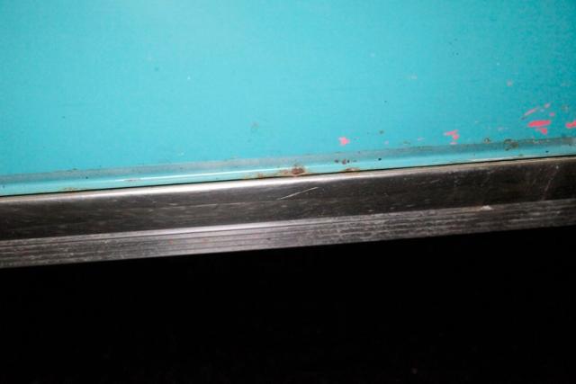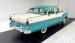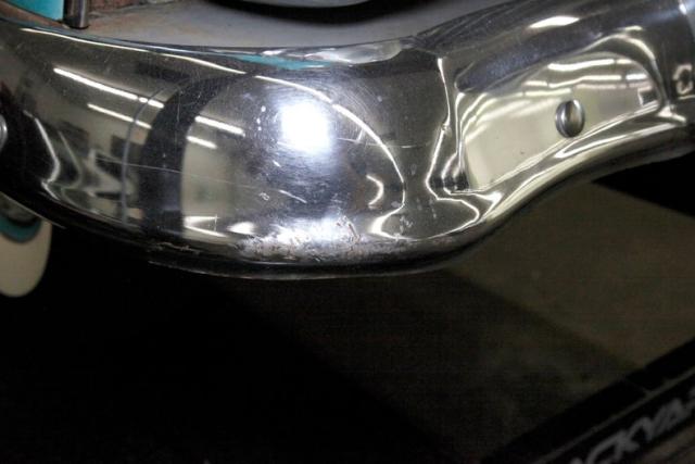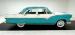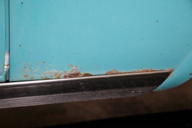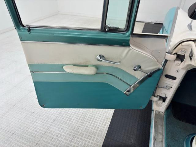 More excess in the form of attention to detail and use of multi colors from the same color way on the door panels. Using shades of cool green and white, the door panels have a curved streak stretching across them. All these curve and form areas for the door handle, door pull and window crank to shine, and they do very nicely. Speaking of shining, the sills are an eye catcher in the green. Slipping our eyes inside, we see front and rear benches stretching from door to door, and covered in white vinyl uppers and bolsters with blue green vinyl smooth inserts and lower backs. Fronting these luscious seats is a metal dash, in full restored style. A turquoise blue dash top and lowers matches the seats. A crescent gauge cluster has steel blue backgrounds, and just below a smattering of knobs and pulls. A blue/green bakelite big steering wheel fronts the dash, and in dash central are round temp slider panels, radio and a clock, not unlike the tail lighting and looking jet age fer sur. Blue carpeting floods the floors, and above is a tight blue headliner. Neato Man.
