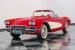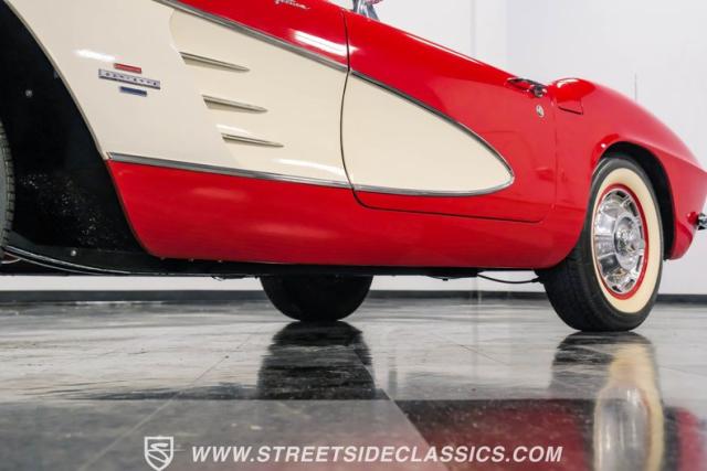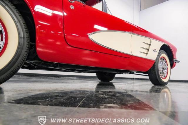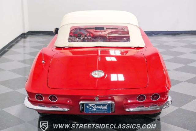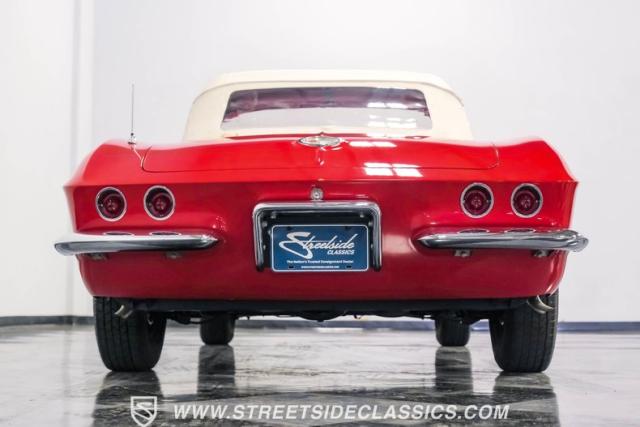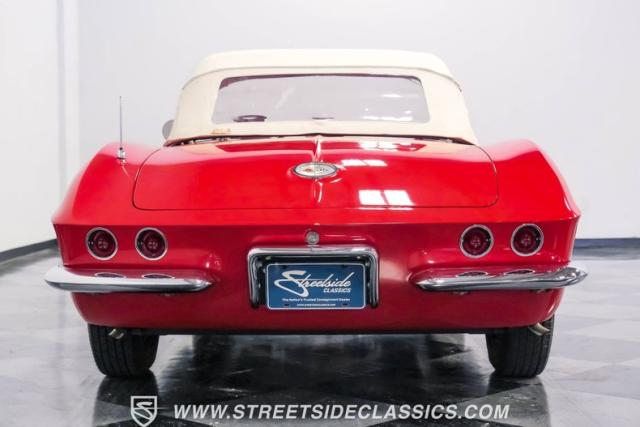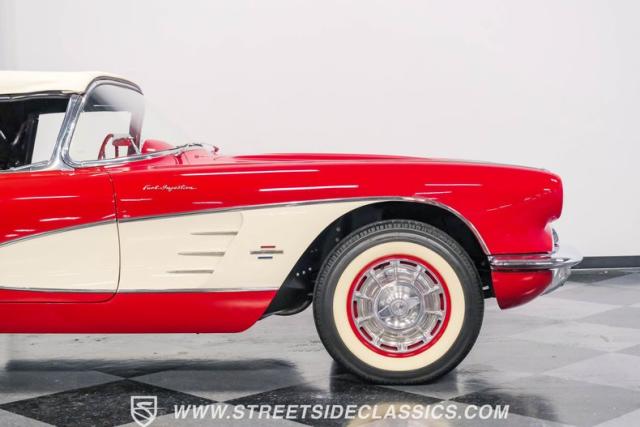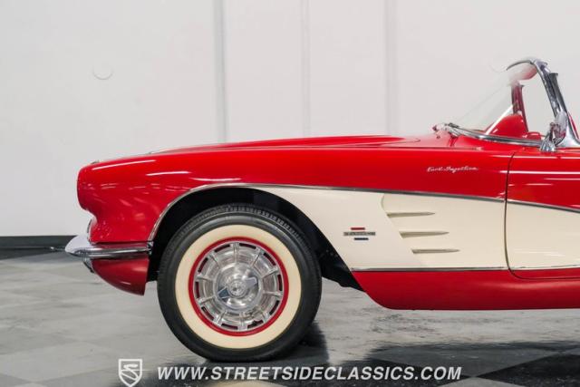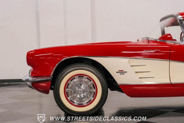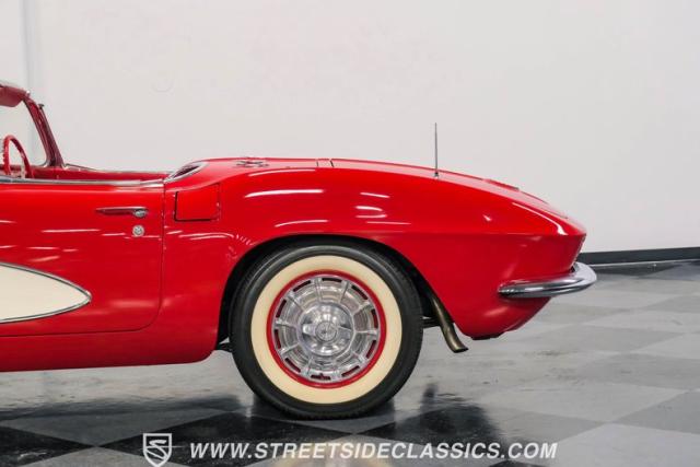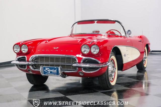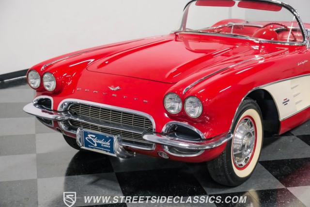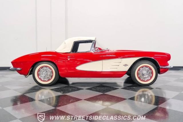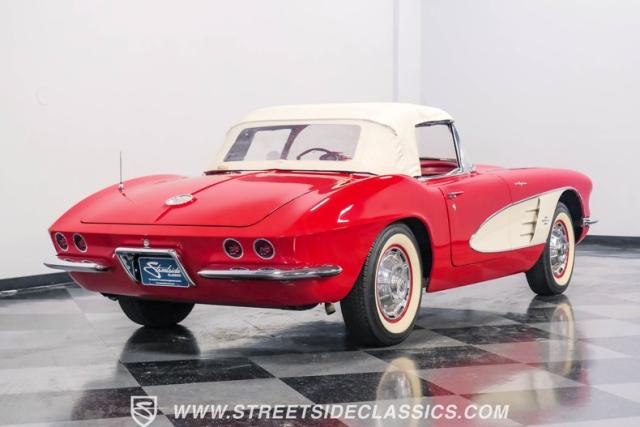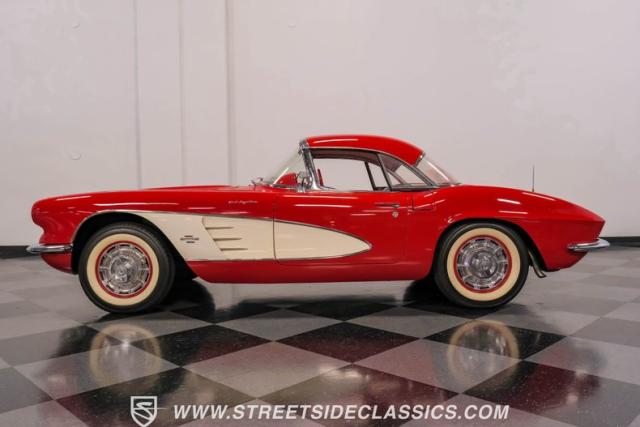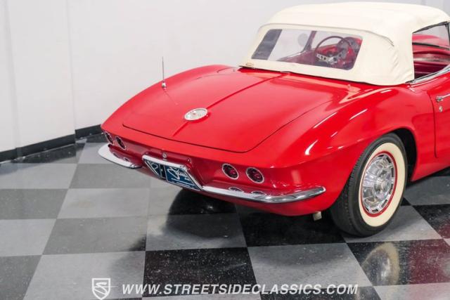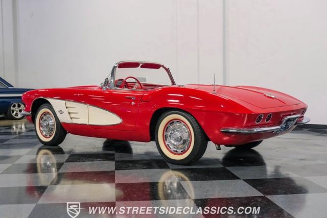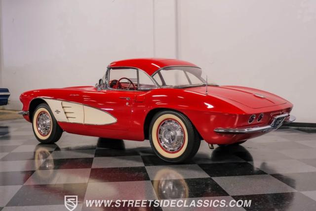 This 1961 Chevrolet Corvette Fuelie Convertible is a rare gem in the automotive world. Sporting a vibrant Roman Red exterior with crisp white accents, this Corvette showcases the iconic first-generation design that put America on the sports car map. The sleek, flowing lines are accentuated by chrome trim that gleams in the sunlight. Rolling on 15\" wheels wrapped in 205/75R15 Coker Classic tires, this Corvette maintains its period-correct stance. The white vinyl convertible top adds a touch of contrast, while the removable red fiberglass hardtop offers versatility for any driving condition.