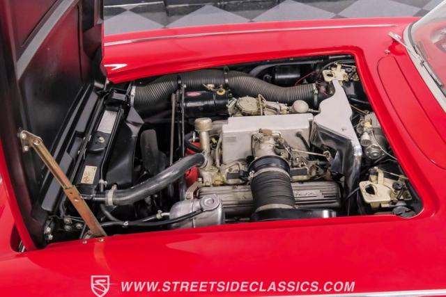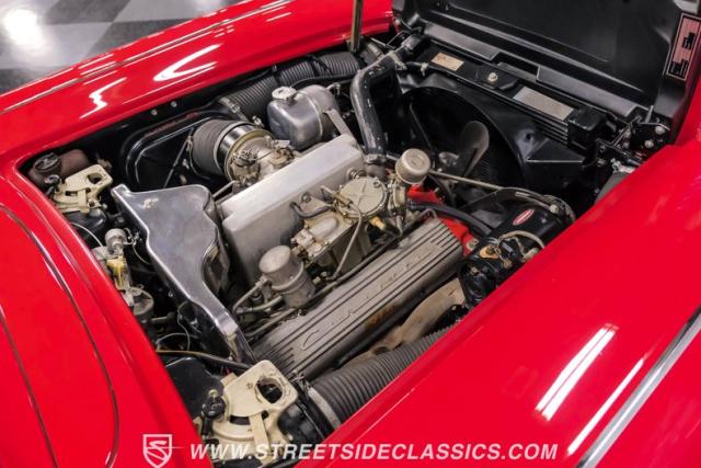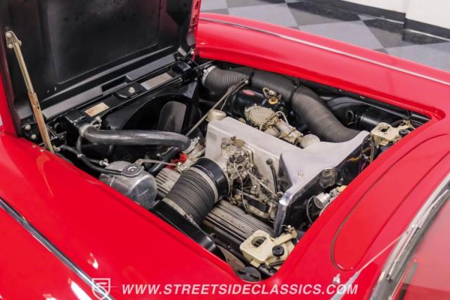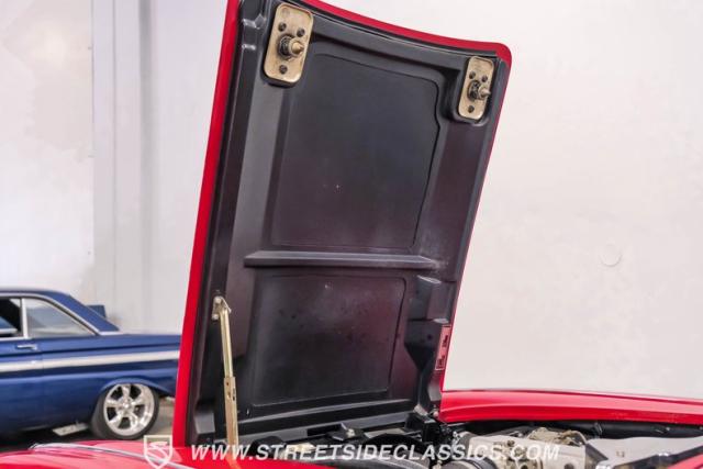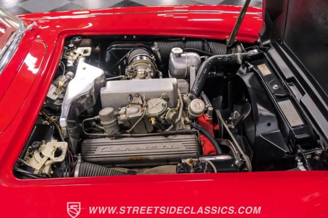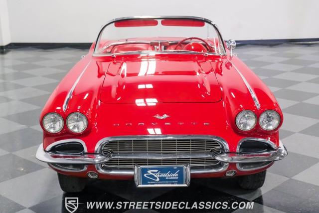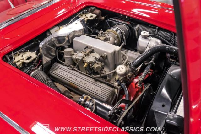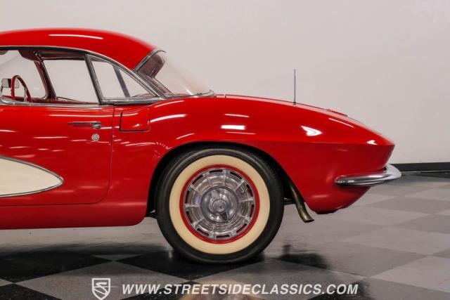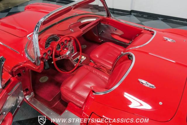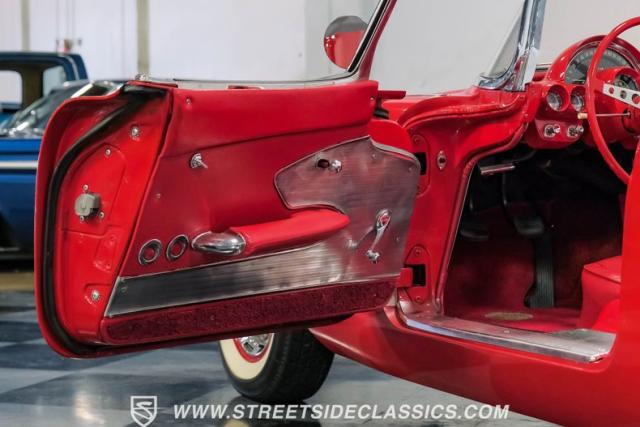 Step inside, and you\'re greeted by a striking red vinyl interior that mirrors the exterior\'s bold aesthetic. The bucket seats provide both comfort and support, perfect for spirited driving or cruising. The floor-mounted shifter for the 4-speed manual transmission sits ready for action. This Corvette\'s cabin is a testament to the era\'s focus on the driver, with a clean instrument layout and minimal distractions. The lack of modern amenities like power steering or air conditioning keeps the driving experience pure and engaging, just as it was intended in 1961.