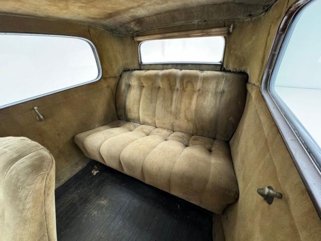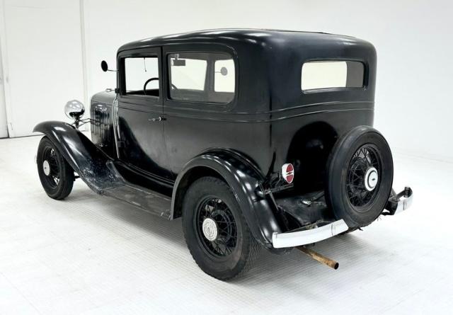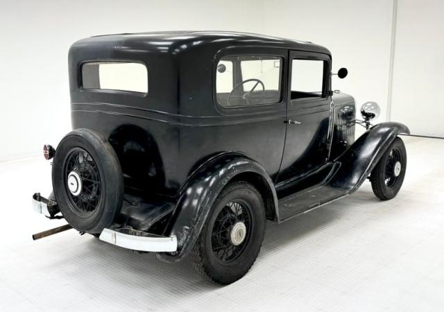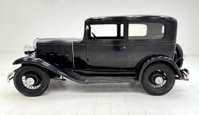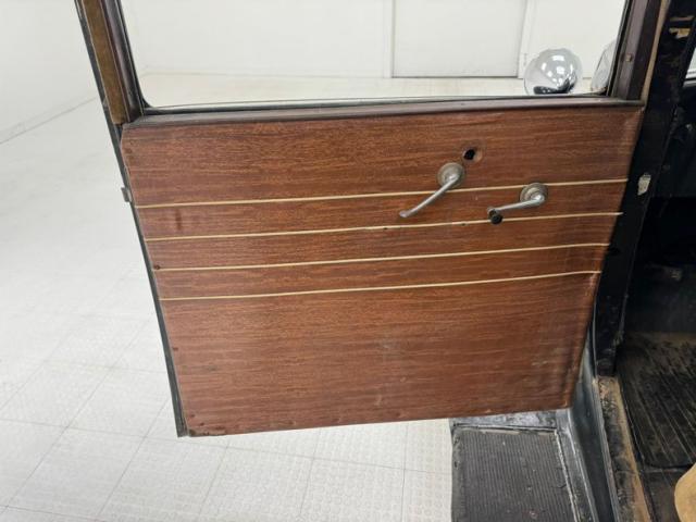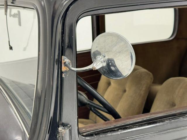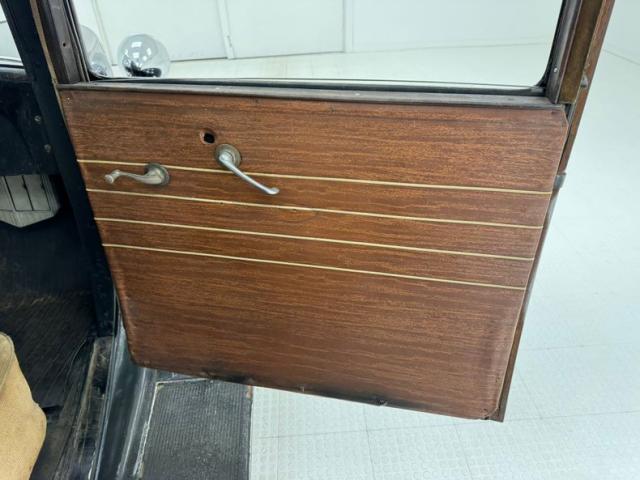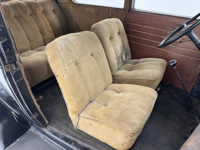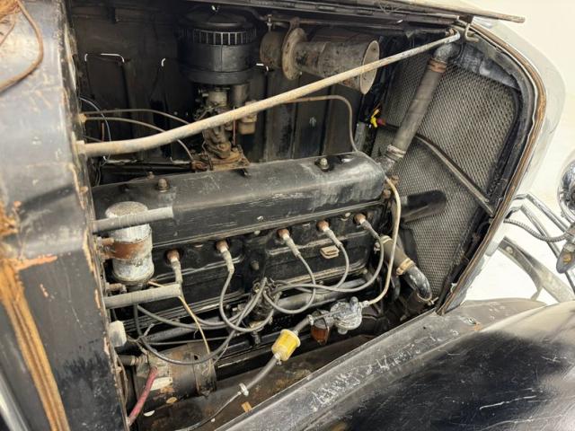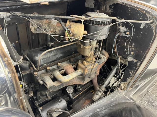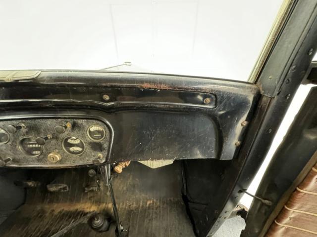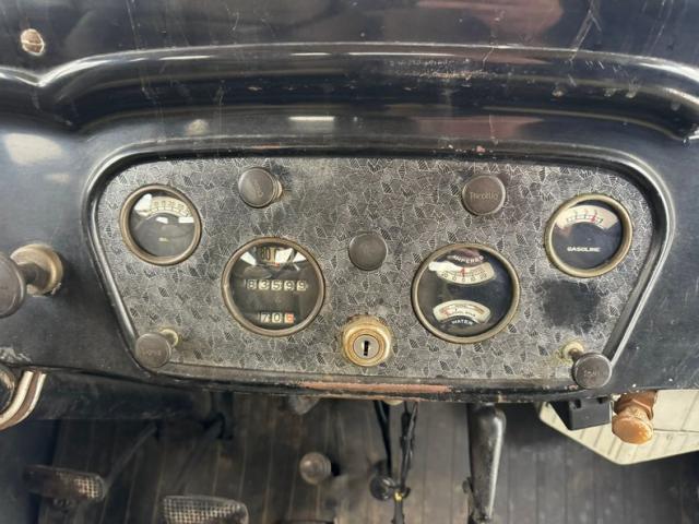 Vinyl wood grain overlay covers the door panels and while it looks clean, the doors would have been covered in the same material as the seats, which is a brushed cloth. Our driver\'s bucket seat is torn and worn and the passenger bucket is rough, but the rear bench is in decent shape. The rear walls and headliner carry over the same tan cloth material. A simple 3 spoke steering wheel greets the driver and the dash is also black. The gauge surround is an amazing design of geographic shapes and patterns that must be seen to be believed. Your first guess might be that this was added later, maybe in the late 60\'s when abstract art was a thing. But no, this is correct for 1932 and its way \"out of the box\". Meanwhile, all the gauges are in place and look good. A floor mounted shifter and hand brake are surrounded by a rubber mat that covers the floor. As noted, the headliner is cloth but will need complete restoration or replacement.