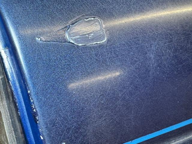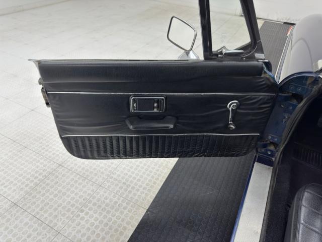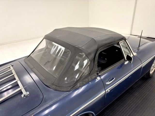 Patsy Cline sang, \"why can\'t you be blue over me?\" and this MGB answers with single stage Cosmic Blue Metallic paint. Over the course of production, MGB\'s were available in dozens of color choices and many blues and you can see why as it\'s a very nice color for the car, still providing a satin shine embellished by a polished body length trim piece, chrome bumpers, and 14-inch wire wheels. There\'s a robin\'s egg blue pinstripe wrapped around the car which meets a white pinstripe floral detail around the trunk latch and it\'s here where you\'ll find a chrome luggage rack for those weekend jaunts in the country. A newer black canvas top takes in three rear plastic windows, all in nice shape. The grille wears a red badge and frames black mesh in polished chrome, flanked by recessed headlights wearing matching polished rings. Imperfections include rust bubbling, touched up and untouched chips, scratches, and peeling paint in a seam.