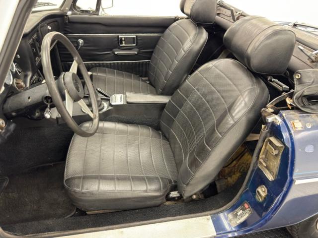 Loose fitting black vinyl covers the door panels in the MG standard configuration, generally a handsome arrangement of patterns and trim. Nice vinyl seats take center stage in the cabin where their weave patterned inserts and robust headrests create an inviting cushion for right pedal pushin and are in nice condition. A black rubber steering wheel fronts an instrument cluster with colored indicator lights and some patina throughout including some cracking on the dash pad. To the right, a Blaupunkt AM/FM/Cassette unit resides over some toggles and knobs in a console that leads to the black booted shifter. Black loop carpet covers the floor and also loosely over the storage shelf behind the seats, while the trunk is uncovered and housing a spare wire wheel.