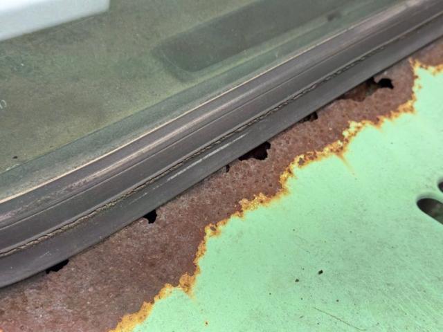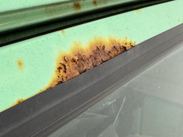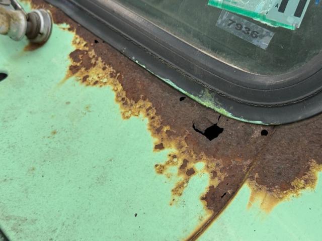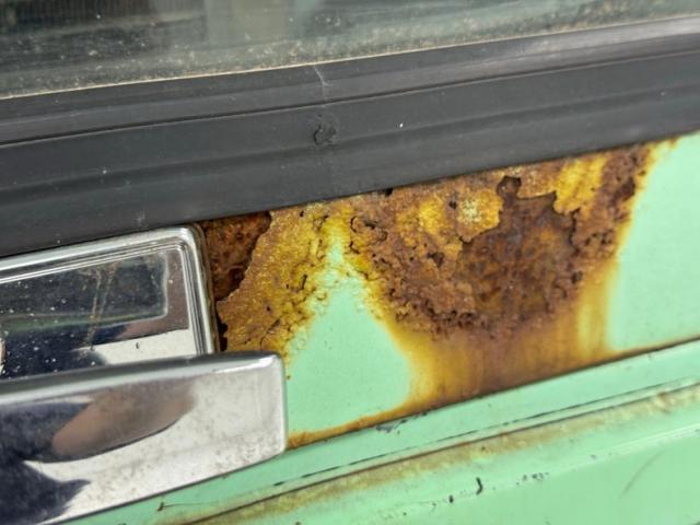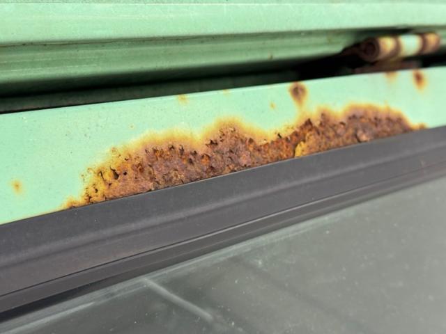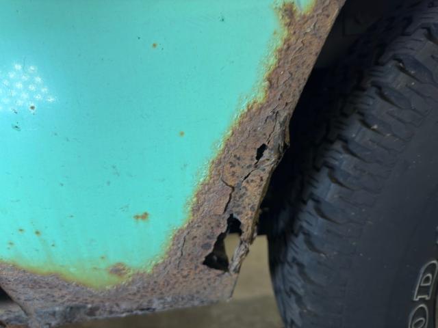Available for 1979 only, Mint Green covers the truck in single stage application, here contrasted by lots of patina in the form of surface rust that flows from marker lights, fuel filler, side mirrors, and window trim. From the front, the Scout appears in good shape with a straight hood, intact grille and mostly straight bumper. Get close to the windshield and you will find rust through at the base while the roof is fully intact including the drip rails. The entire bottom edge is lined with rust and some of that is all the way through while rocker panels and roll pans are completely gone in most spots and parts of wheel openings are barely hanging on. All hubcaps are in place and carry 235/75R15 tires on the 15-inch wheels.