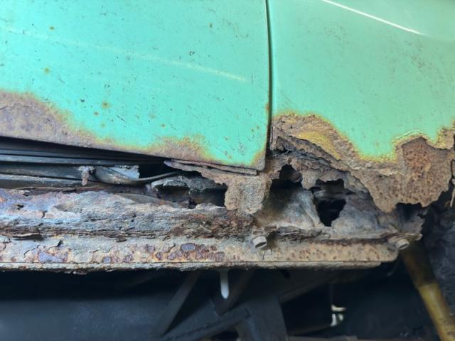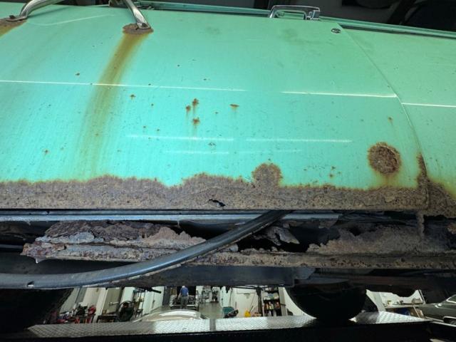 Black vinyl door cards are framed in mint and show some age, although we could not open the passenger door to get a full view. The sill has rusted away on the driver\'s side so you\'ll step up into the cabin to find a split bench seat with the driver\'s side torn up. The rear holds parts only and perhaps a rear bench. Up front, the simplest steering wheel leads to a basic, horizontal instrument cluster and all of its fairly dusty, while the center holds an AM radio along with vent levers nearby. The shifters rise from the transmission tunnel and the driver\'s floor has what Vice Grip Garage refers to as weight saving, with a hole in the floor clear through to the road. The perforated headliner is in decent condition.