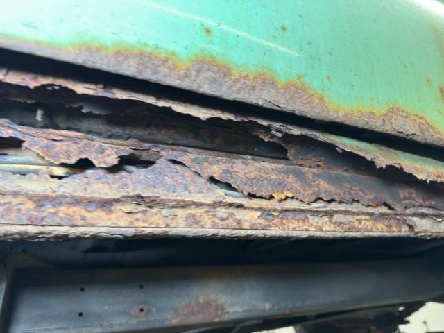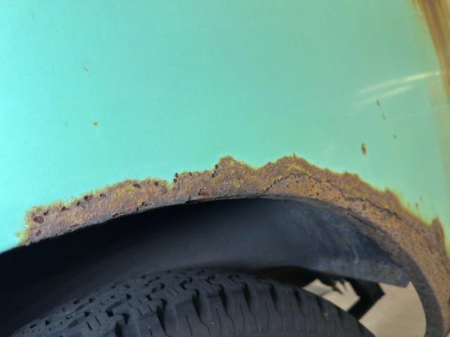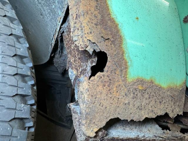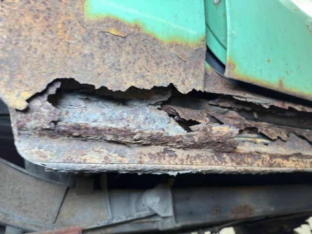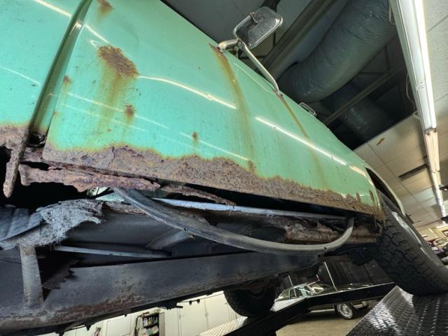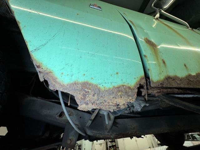 The rust continues underneath, of course, but the main frame beams are in good shape. There\'s oil on both differentials, the oil pan, transmission, and transfer case. The single exhaust runs through a stock style muffler, exiting under the truck and is intact. Suspension consists of leaf springs front and rear and power brakes, front disc, rear drumequip the wheels. The inner rocker panels and some flooring as noted, is rusted through.
