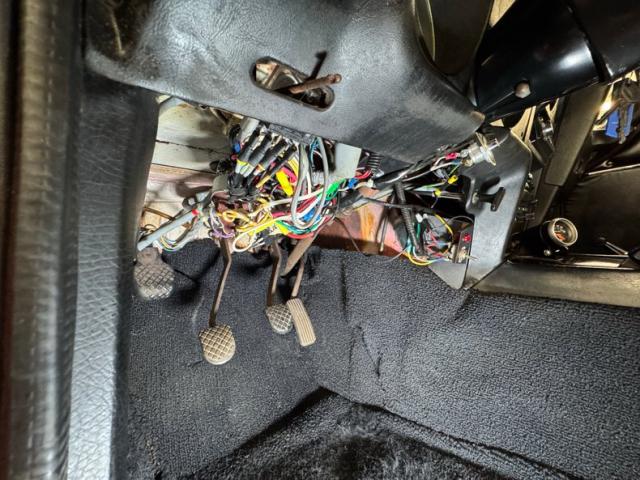 Pleated black vinyl inserts are framed with smooth panels and silver trim on the doors, looking clean and intact. Tall bucket seats with leather seat covers have a tuck and roll insert and the bottoms sit low to the floor allowing for butt first entry, and both seats are in great shape. A vinyl wrap makes the three spoke steering wheel grippy and leads to a simple dash sporting a new dash cap over basic round gauges with the center stack unit canting towards the driver and including a clock. Also in the center stack is an AM/FM/CD radio with AUX and USB ports over a series of standard toggle switches and vent levers. A voltmeter has been added and resides on the center console where we also find the very cool shifter wrapped in a circular accordion style boot. The black carpet in the footwells and rear cargo area along with the headliner are all in great shape.